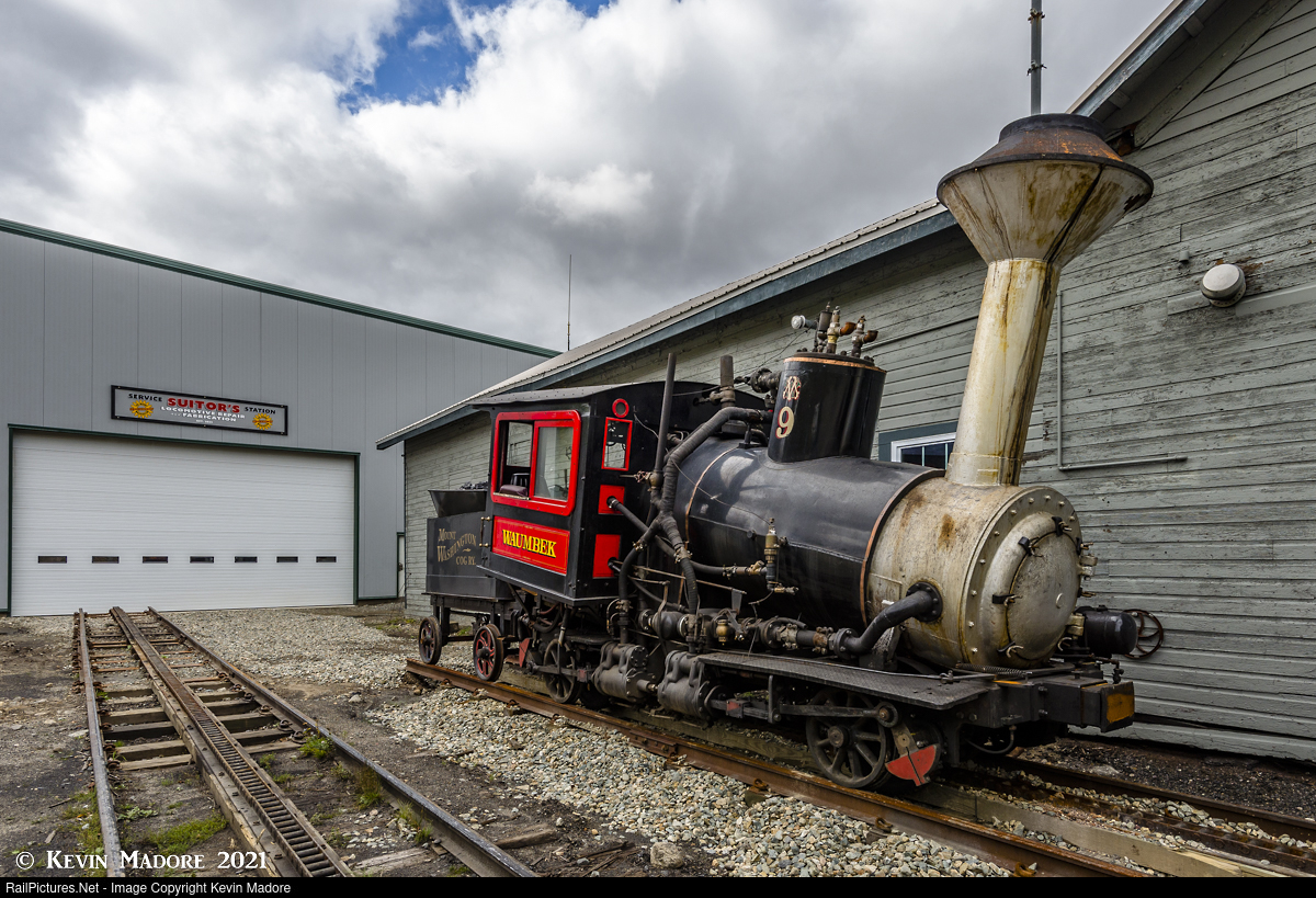 In reserve. Waiting in reserve outside the company's engine shops below Marshfield Station is the Mount Washington Railway Company's other operable steam locomotive, the #9, known as "Waumbek." She hasn't been out much in the last couple of years, as she's been undergoing some heavy mechanical work, mainly on the running gear. I would expect to see her out more in the coming years. Although she was technically built in 1908 by the Manchester Locomotive Works, that's more Wikipedia trivia than anything. Virtually nothing on any of these cog locomotives is original from 1908. They have all been rebuilt many, many times. They don't even have a number plate that survives.