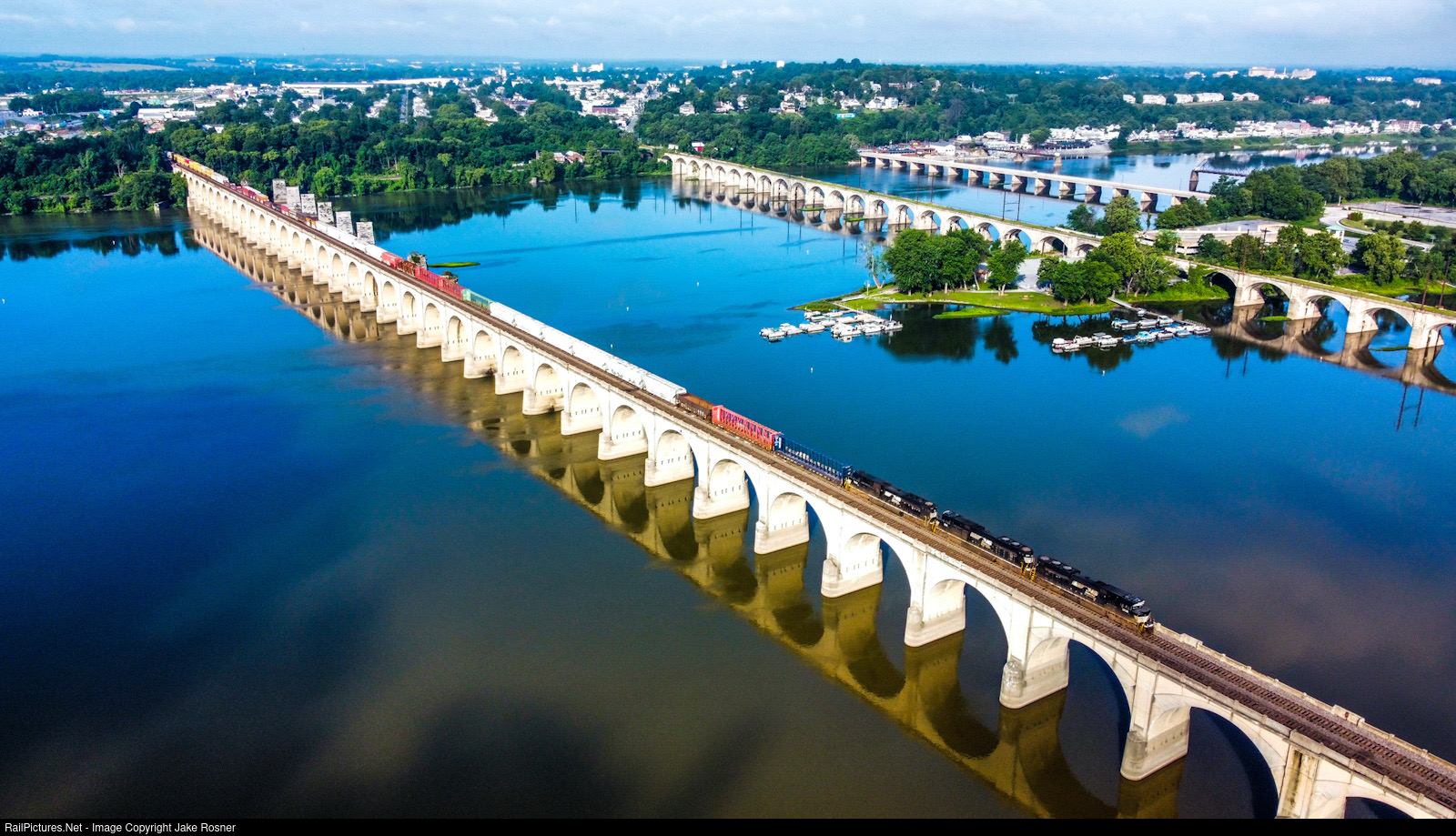 NS 12Z, with a solid EMD lashup, sits halted over the beautiful ex-Reading lines bridge that crosses the Susquehanna river in Harrisburg Pennsylvania.