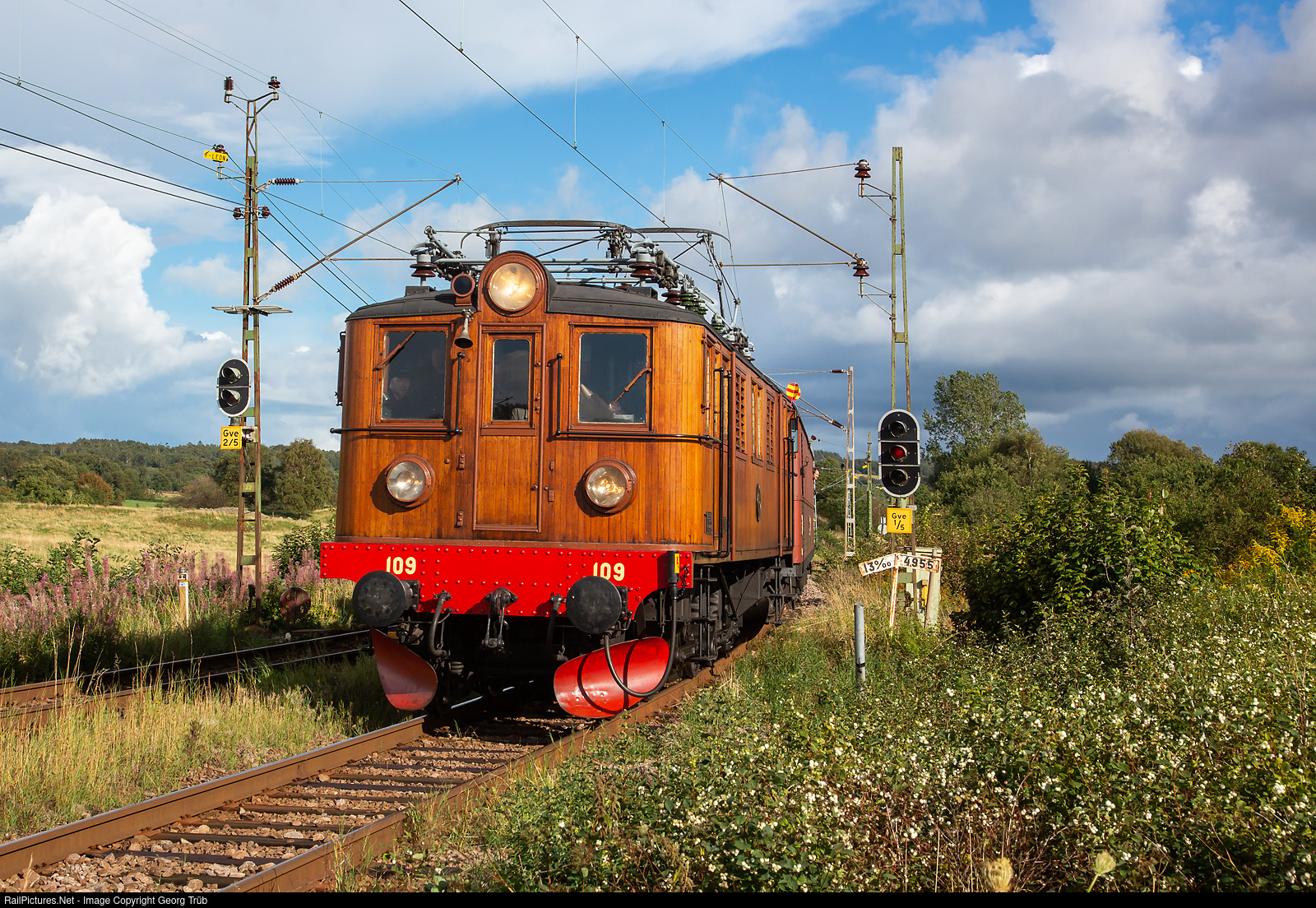 | Du # 109 of association Östra Skånes Järnvägar in Kristianstads, with a charter special from Aengelholm over Hallandsåsen to Båstad Nord, entering Grevie for a crossing with a X55 (SJ3000) trainset of the SJ. The 1`C 1`locomotive with rod drive was built in 1925 by ASEA and NOHAB for the Statens Järnvägar. The train had run on a 1.3 % grade for 4955 meter. This steep and curvy section of the west coast mainline over the Hallandsåsen mountain was replaced in december 2015 by a new double track (two single bores) 8,5 kilometer long tunnel. This line here was shut down and demolished. |