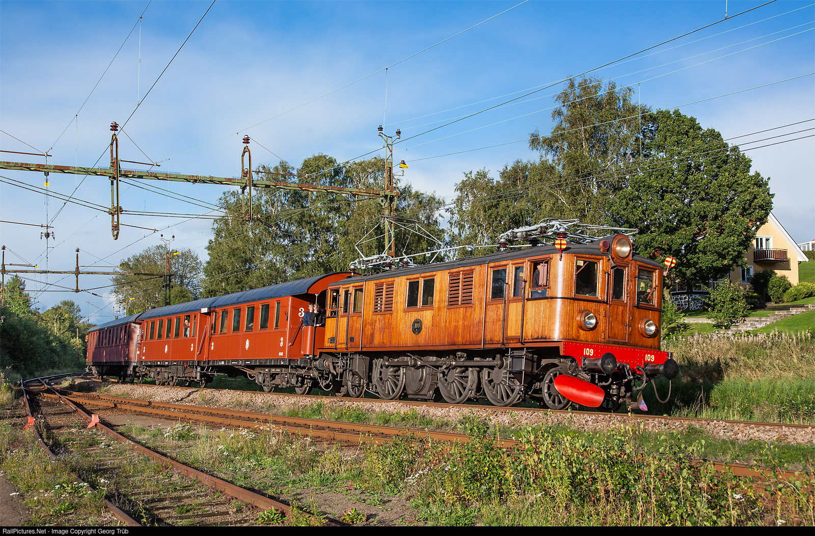 | Du # 109 of association Östra Skånes Järnvägar in Kristianstads, with a charter special from Båstad Nord over Hallandsåsen to Aengelholm, entering Grevie for a crossing with a X2000 trainset of the SJ. The 1' C 1' locomotive with rod drive and wooden body was built in 1925 by ASEA and NOHAB for the Statens Järnvägar. This steep and curvy section of the west coast mainline over the Hallandsåsen mountain was replaced in december 2015 by a new double track (two single bores) 8,5 kilometer long tunnel. This line here was shut down and demolished. |
