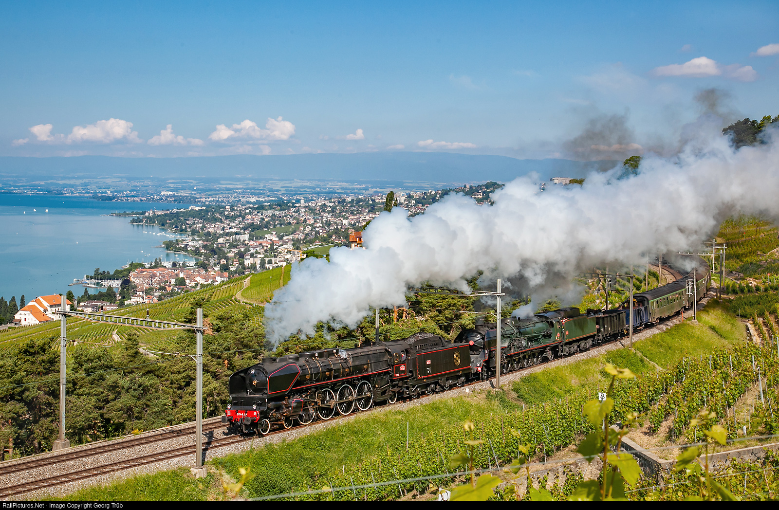 Two large ex French Railways (SNCF) 4-8-2 steamlocomotives with the long special "Vapeur Swiss Express" on the 1.8 % (max 2.1 %) ramp from Lausanne on the Lake Geneva up to Puidoux-Chèxbres. First is 241 A # 65, based in Full/Switzerland since many years, operated by association Dampflok Depot Full (DDF), second the 241 P # 17, guest from Le Creusot (France). The train was crossing Switzerland from Geneva via Lausanne-Fribourg-Berne-Olten-Lenzburg-Bözberg to Basel. Brian Stephenson photographed the original Swiss Express of the SBB on this beautiful location exactly 26 years before! See ID=252343