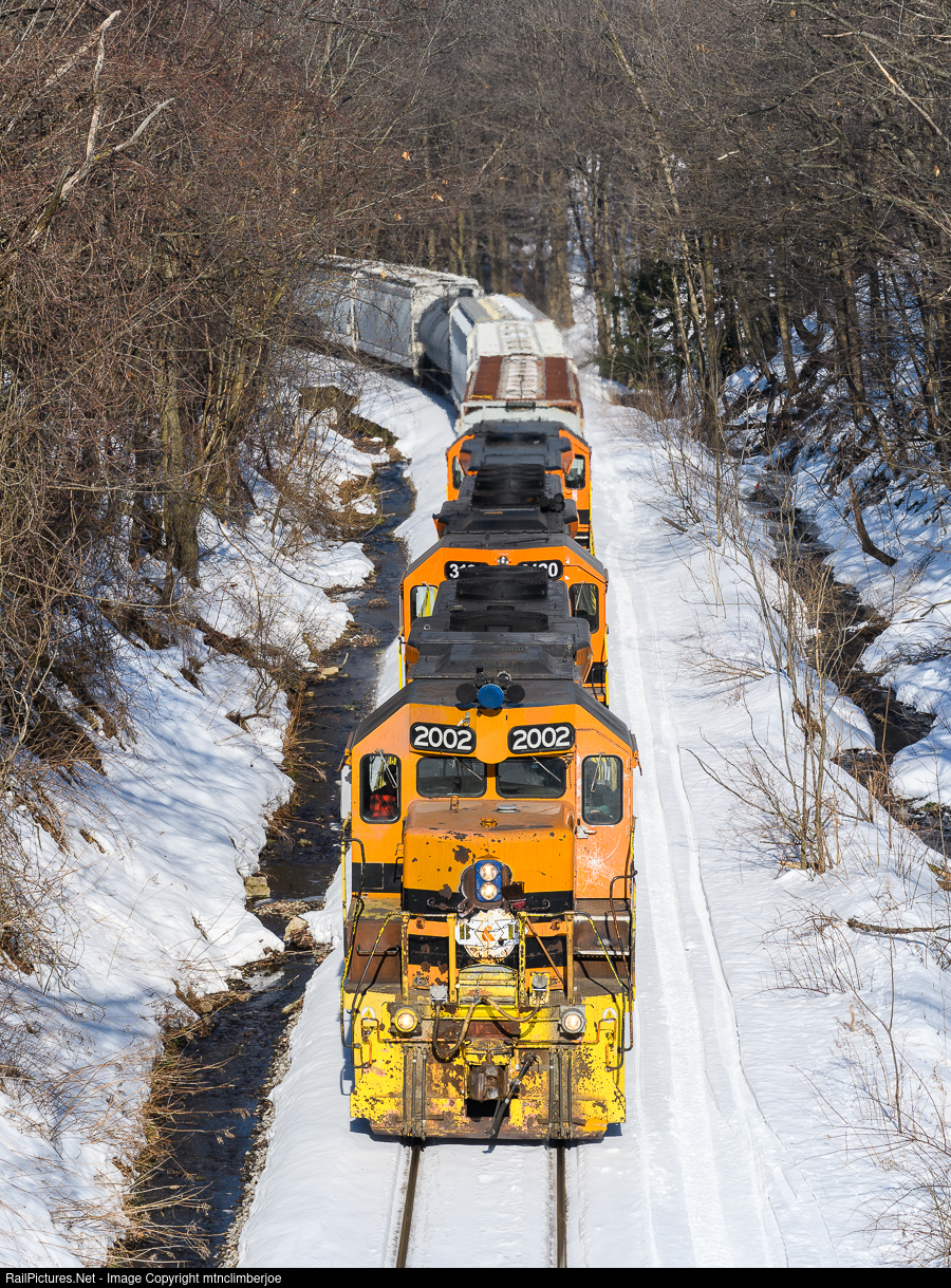 | The Buffalo & Pittsburgh's WAER rounds the bend along Wintergreen Gorge as it climbs the grade departing from Erie, Pennsylvania behind a trio of GP's, led by the well worn straight GP38 2002. |