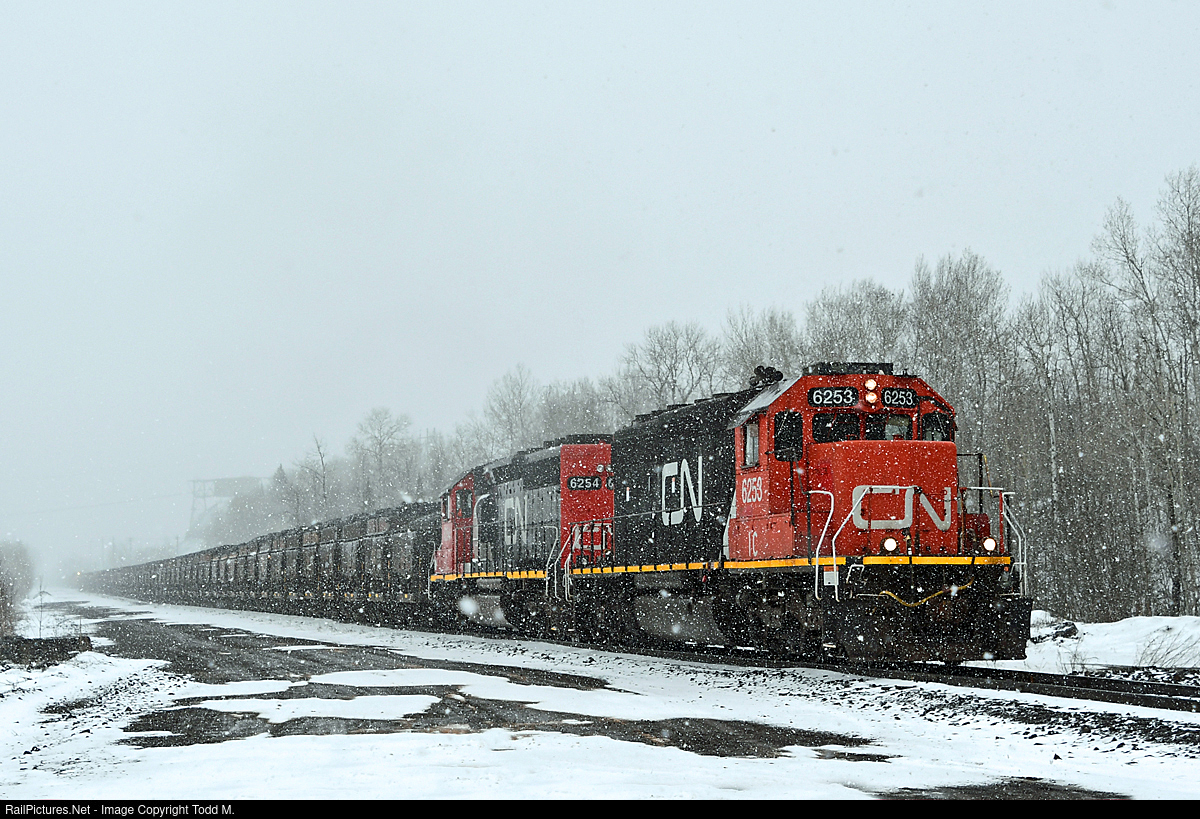 | IC 6253 and sister IC 6254 are paired up to move rock from the mine to the plant to keep Cliffs United Taconite operations humming along. Here they are departing Largo with loads while the snow falls. |