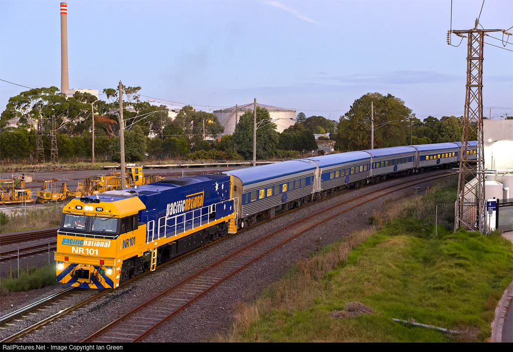 | Fresh out of the paint shop, NR101 leads the Overland service from Adelaide to Melbourne through suburban Newport. |