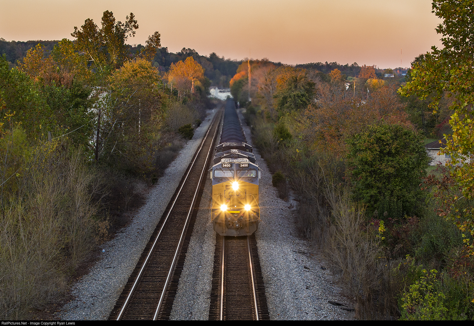 Traveling Westbound through Hurricane as the Sun is setting on this Fall evening. CSX ET44AH 3400 pulls on 100 loads of Coal as he heads towards Russell, Kentucky.