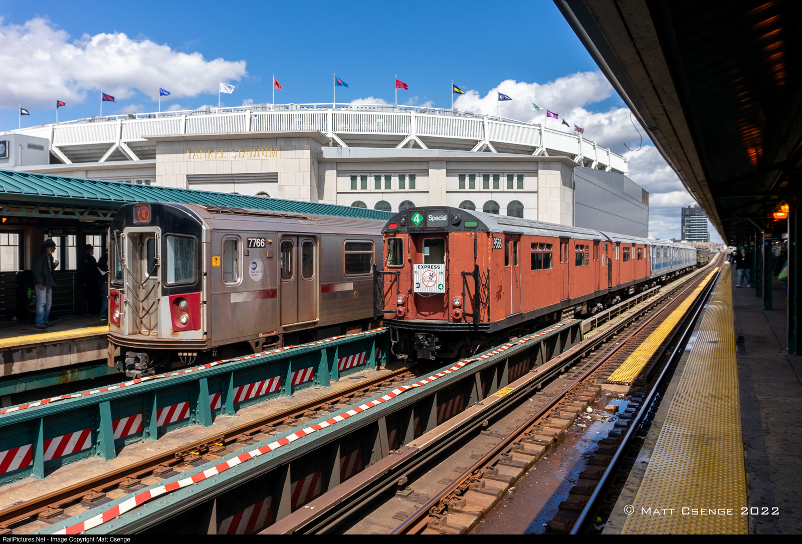 On April 8, 2022, the NY Transit Museum ran two special excursion trains for the Yankees home opener. One of these trains consisted of four IRT Lo-V cars, and the other six "Redbirds"; four R33s (painted in "corporate scheme") and two R36WFs. Here R36WF 9586 is seen on the south end of the excursion train laid up at 161st St Station, adjacent to Yankee Stadium, while a Manhattan-bound R142 (4) train arrives at the station.