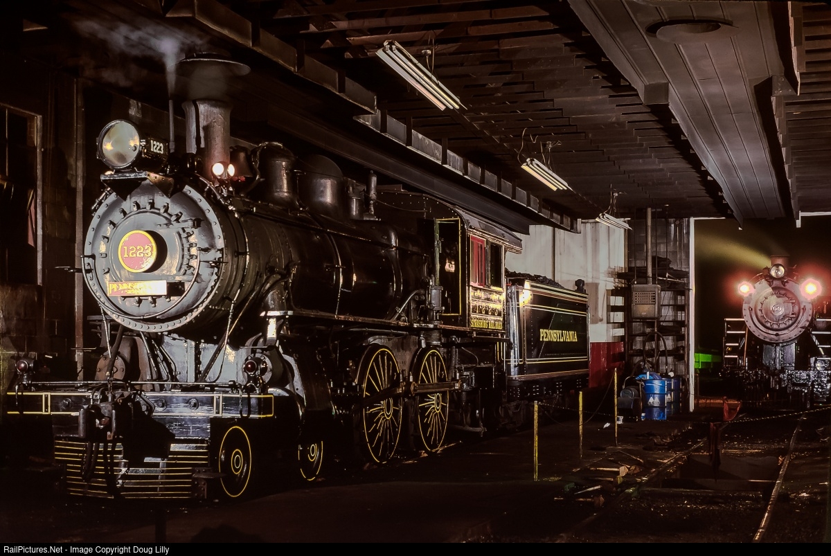 | After an afternoon shooting at Strasburg, a friend and I decided to set up for some night photos. We soon discovered that one of the night hostlers was fellow Lehigh University Model Railroad Club alumnus John Murray. We were invited inside the engine house to get an image of my two favorite Strasburg locos. PRR 4-4-0 1223 was in its stall, while Strasburg 2-10-0 90 waited outside. |