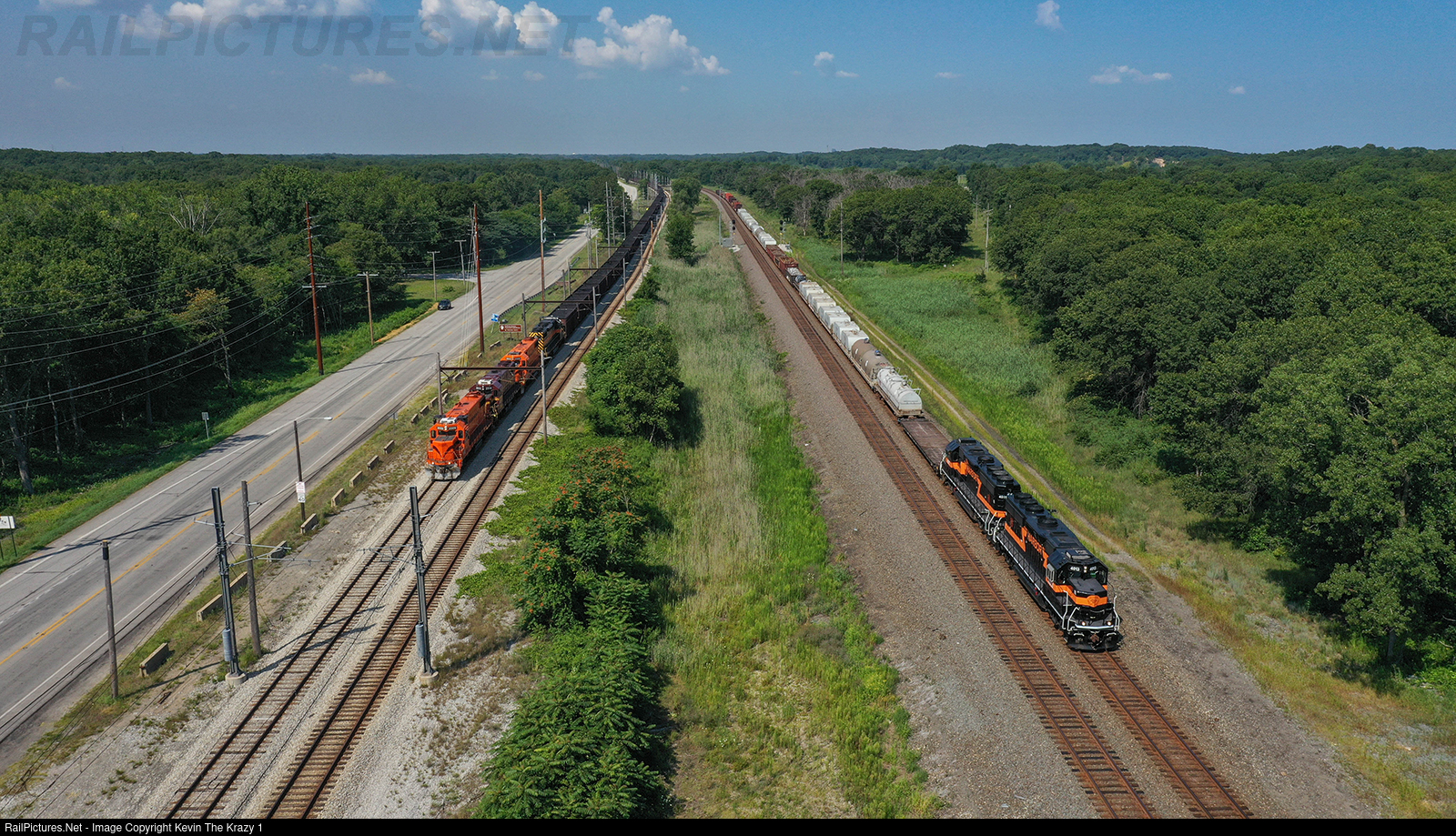 A South Shore coal train for Burns Harbor is seen passing a slow moving IHB job 115 at Ogden Dunes.