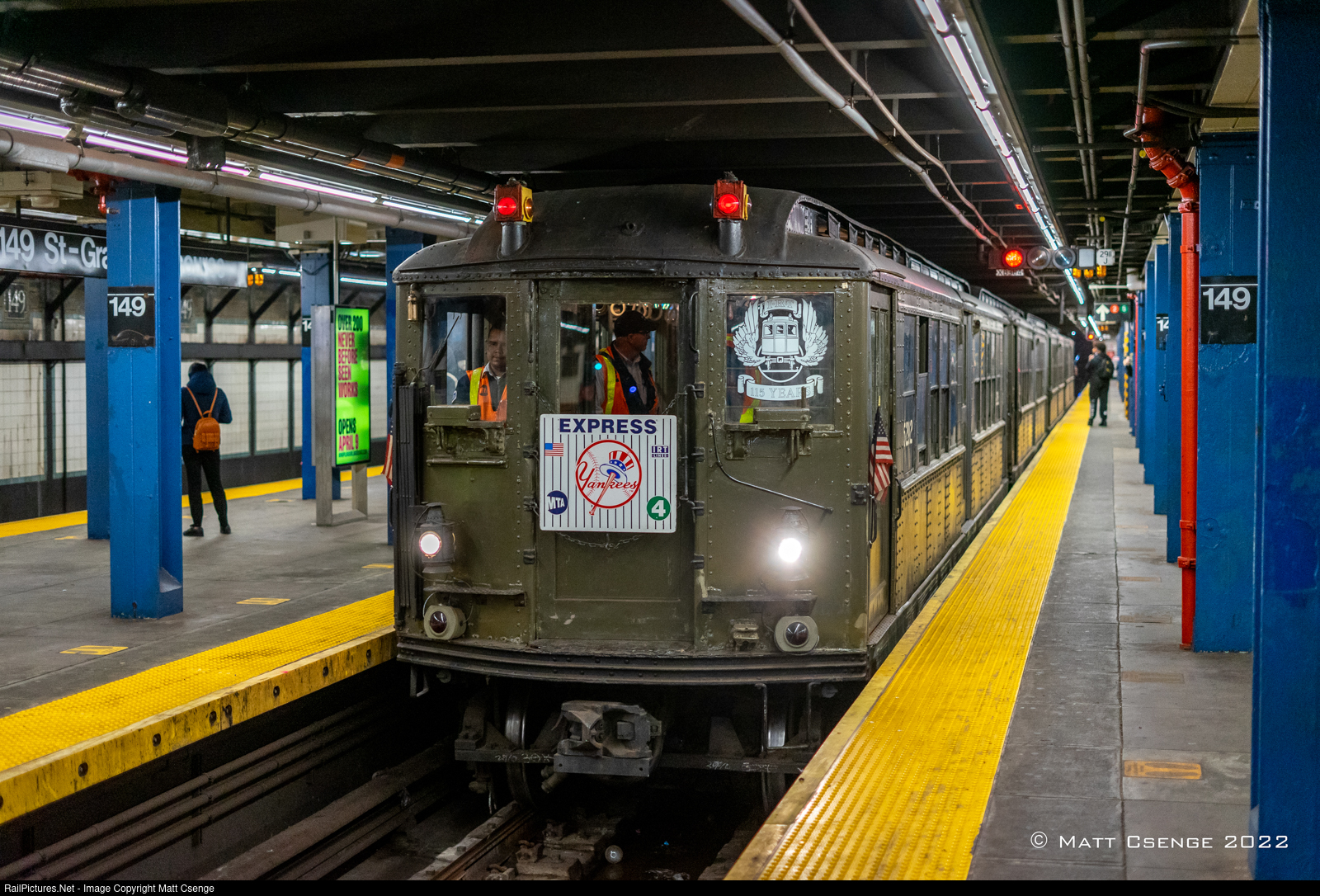 Lo-V 5292 is the lead motor on a relay move passing through 149th St-Grand Concourse station on April 8, 2022. The train of four cars is en route back to E 180th St Yard after a special run for the Yankees home opener.