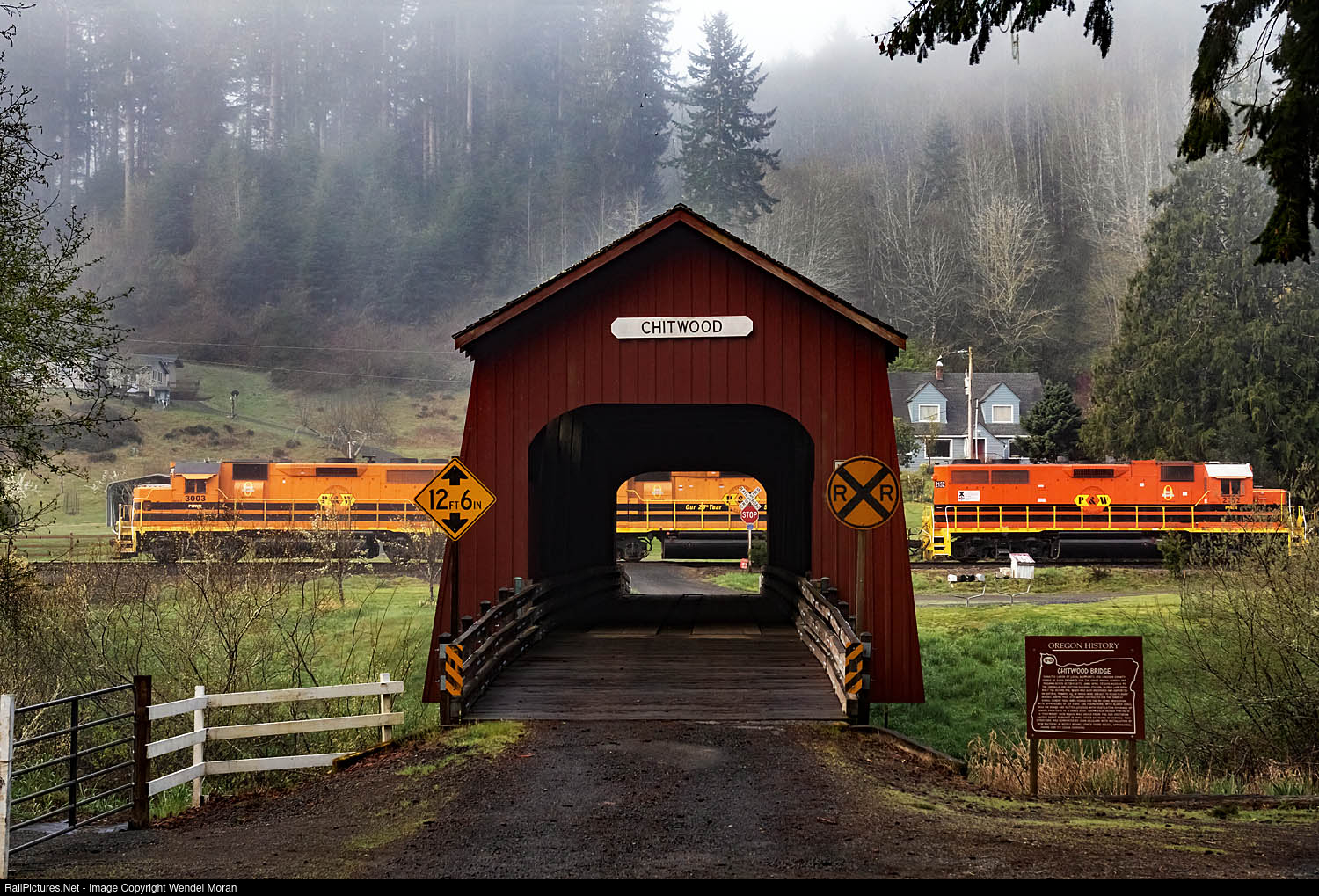 The Toledo Patch passes the Chitwood covered bridge as it rolls eastward to Albany. Just as in Southern Pacific days, the line primarily serves the massive Georgia Pacific pulp mill at Toledo.