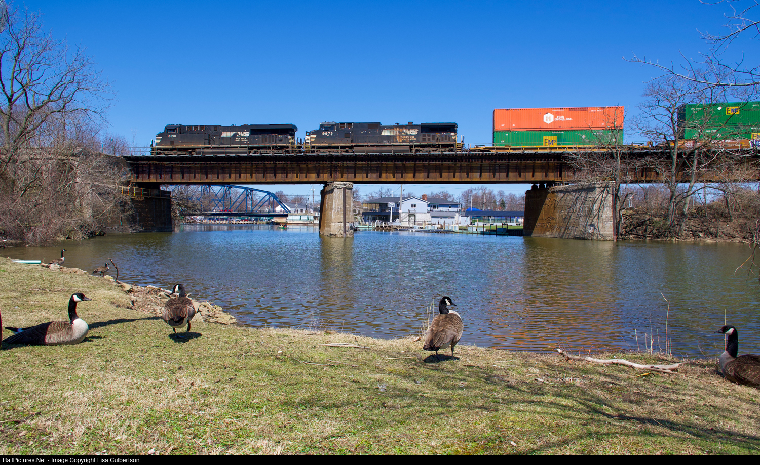 | The NS 23M heads west across the Vermilion River, as several geese look on. I had to tiptoe past these guys, as they are not always the friendliest! |