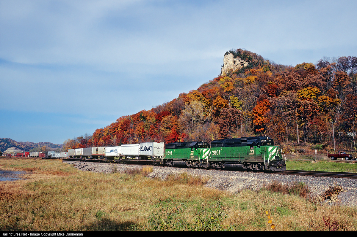 Burlington Northern second train 2 proceeds past some colorful autumn colors on the bluffs lining the tracks at La Crosse, Wisconsin, on October 14, 1989. Both locomotives are rebuilt, with GP39M No. 2801 being the former Union Pacific EMD GP30 No. 827, and GP40M No. 3501 being the former Chicago, Burlington & Quincy EMD GP40 No. 177.