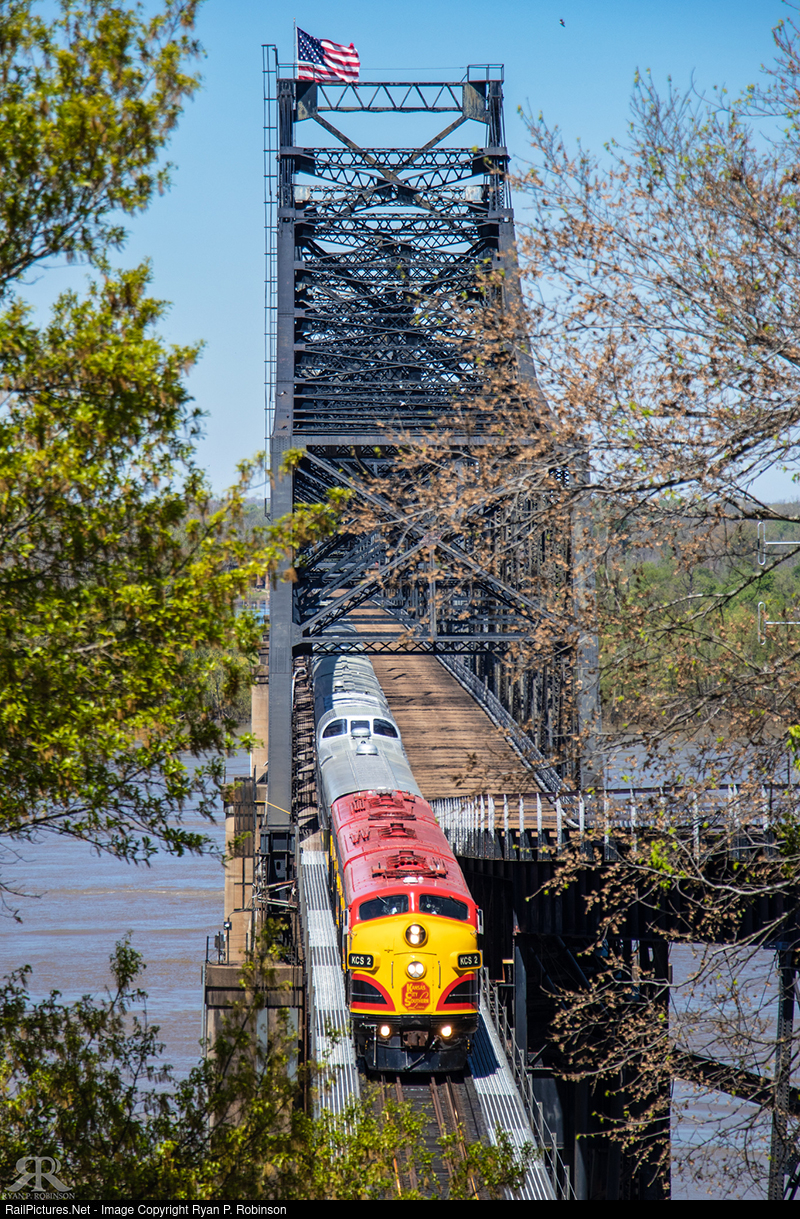 | Kansas City Southern broke out the varnish Saturday in a deadhead run from Shreveport, La. to Meridian, Miss. seen here crossing the Mississippi River in Vicksburg. Canadian Pacific officials will ride the train back to Shreveport to get a first hand look of their new territory acquired through the recent merger between the two railroads. |