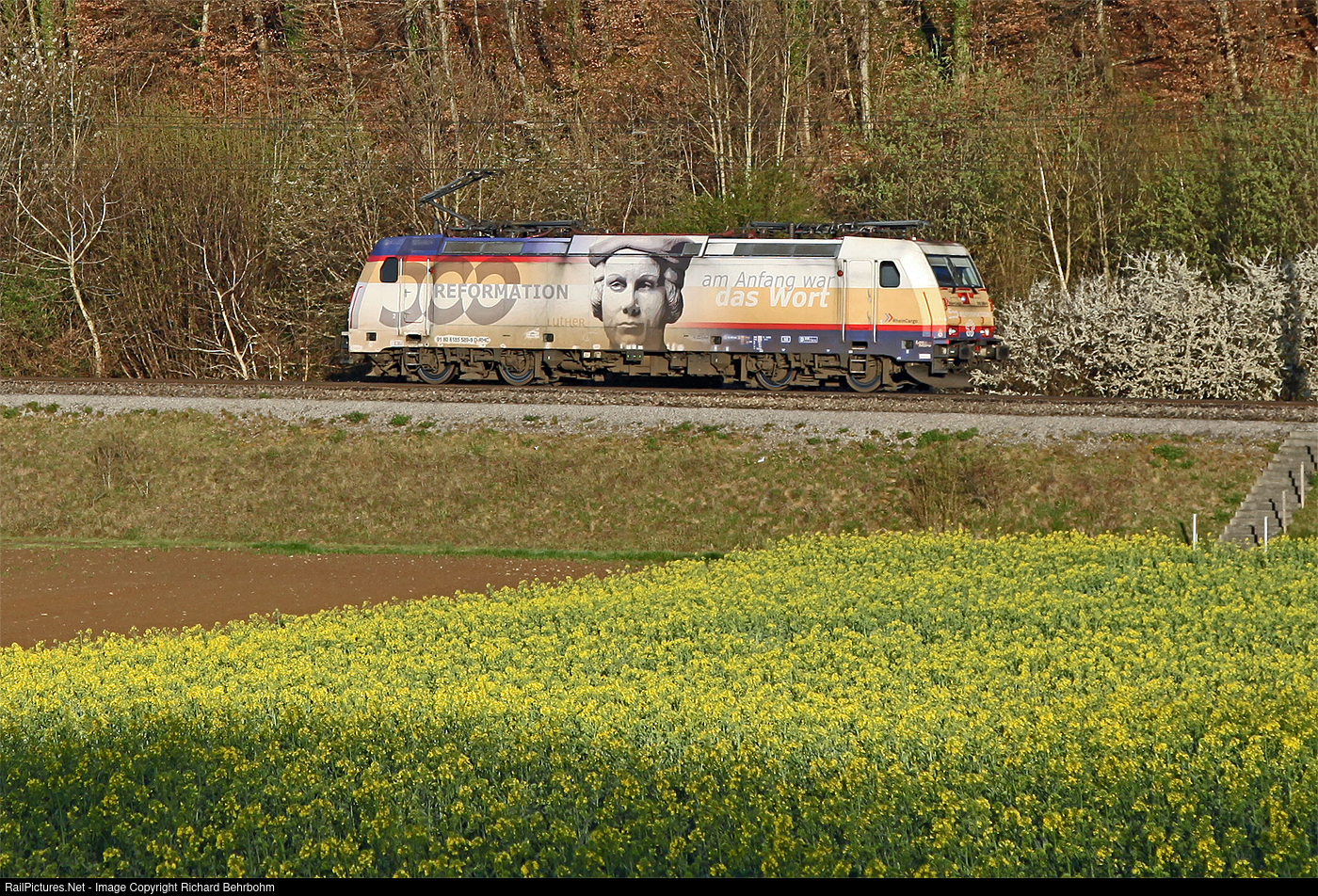 | Bombardier Traxx locomotive 185 589 has since 2017 a paint scheme for "500 Jahre Reformation" (2017 was the "year of Martin Luther"). The locomotive is running light engine Basel - Schaffhausen - Singen. |