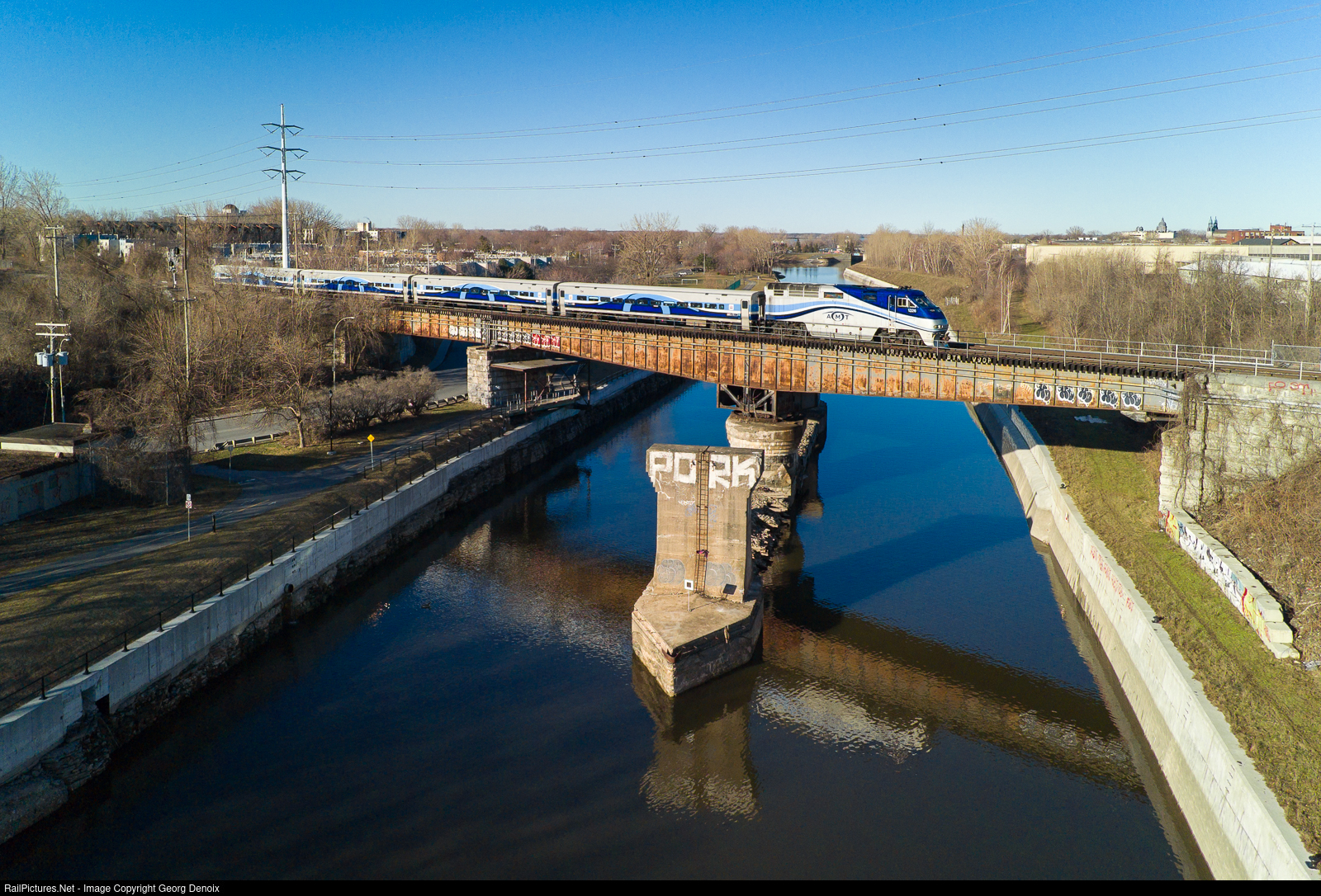 | EXO 76 is the fourth EXO train from Candiac to Montréal this morning and is led by AMT 1326 over CP's Canal Lachine bridge. This former swing bridge erected in 1913 has not seen any large ships in many decades now. The western end of the canal is by the locks in the backround. |