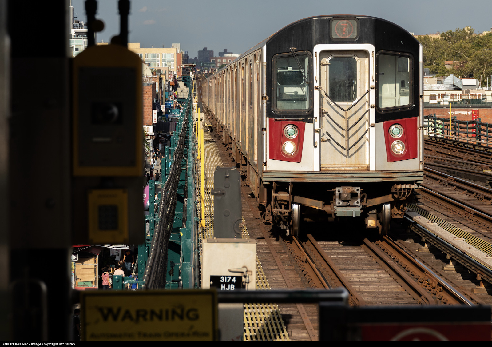 An evening 7 train flies above the crowds in Flushing. The R188s have a real distinctive look to them.