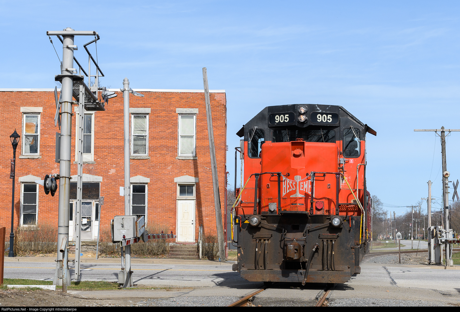| Bessemer & Lake Erie 905 and 862 roll through Girard, Pennsylvania as they head toward the EMSCO Plant to perform some switching and interchange with NS. The train is rolling past the historic Girard Hotel, which has since been demolished. |