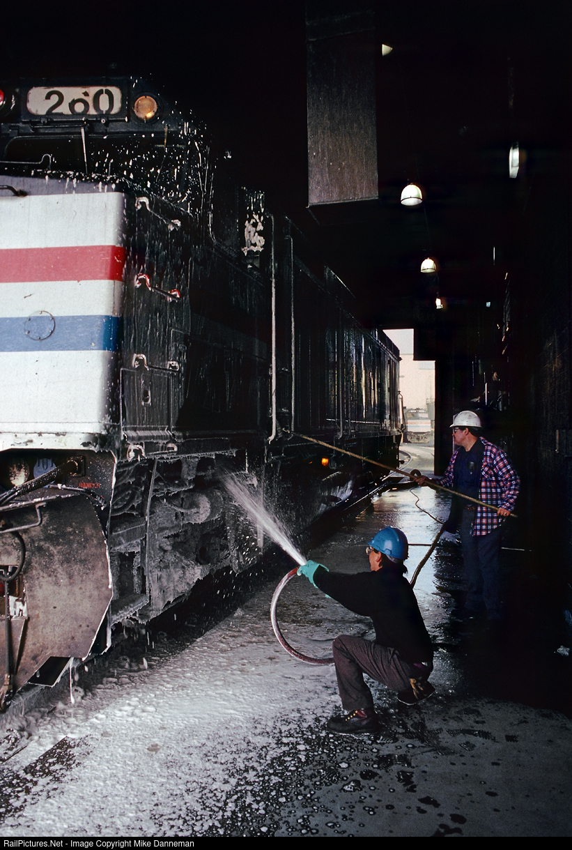 | Amtrak EMD F40PH No. 260 gets a foamy bath inside the wash building at Amtrak’s locomotive facility in Chicago, Illinois, on February 22, 1992. |