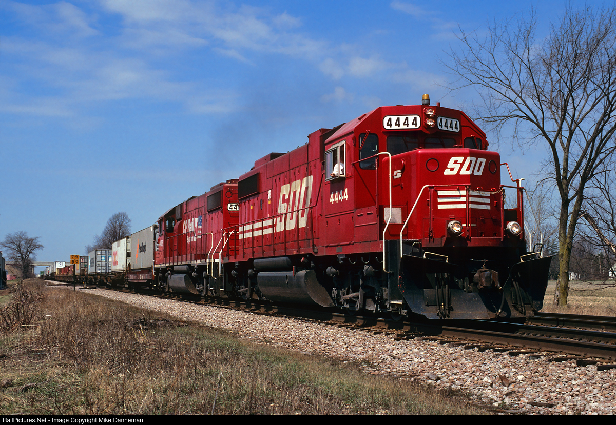 Four fours An eastbound Soo Line intermodal train zips through Duplainville, Wisconsin, led by a locomotive with a lot of fours—Soo Line EMD GP38-2 No. 4444—on April 15, 1997. In 1990, Canadian Pacific gained full control of Soo Line and began slowly integrating the railroad, as can be seen by trailing former Soo GP38-2 No. 4406, in the then-current CP Rail “Duel Flags” scheme.
