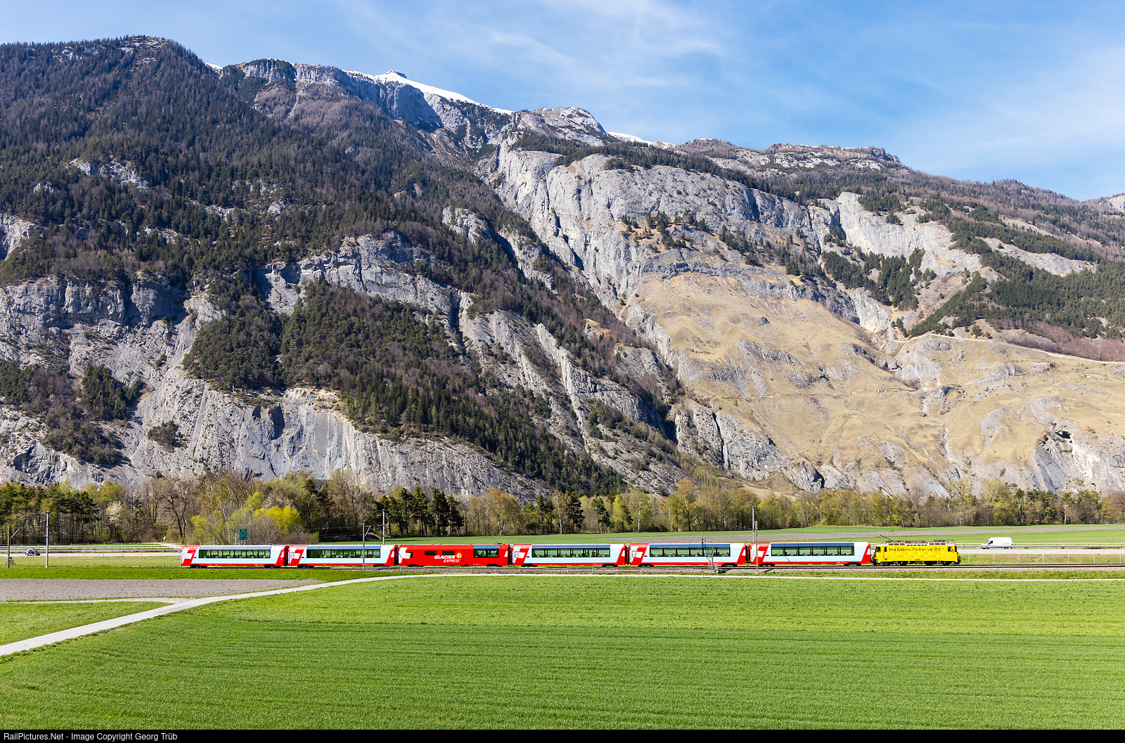 | Ge 4/4 II # 612 of the Rhaetian Railway, in the publicity paint scheme for the Burkhalter group, is pulling the PE 904 GLACIER EXPRESS from Zermatt via Chur to St.Moritz, between Felsberg and Chur. The # 612 took the train over in Disentis from a HGe 4/4 II of the MGBahn. In the background is the Calanda mountain. |