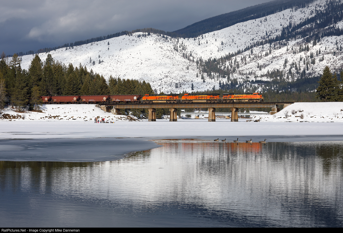 A family ice fishing watches and waves at a BNSF grain train rumbling over Bridge 55 at Trout Creek, Montana, on the afternoon of February 5, 2022. Not far away on the edge of open water, a quintet of Canada Geese float along in a line, mimicking the eastbound train.