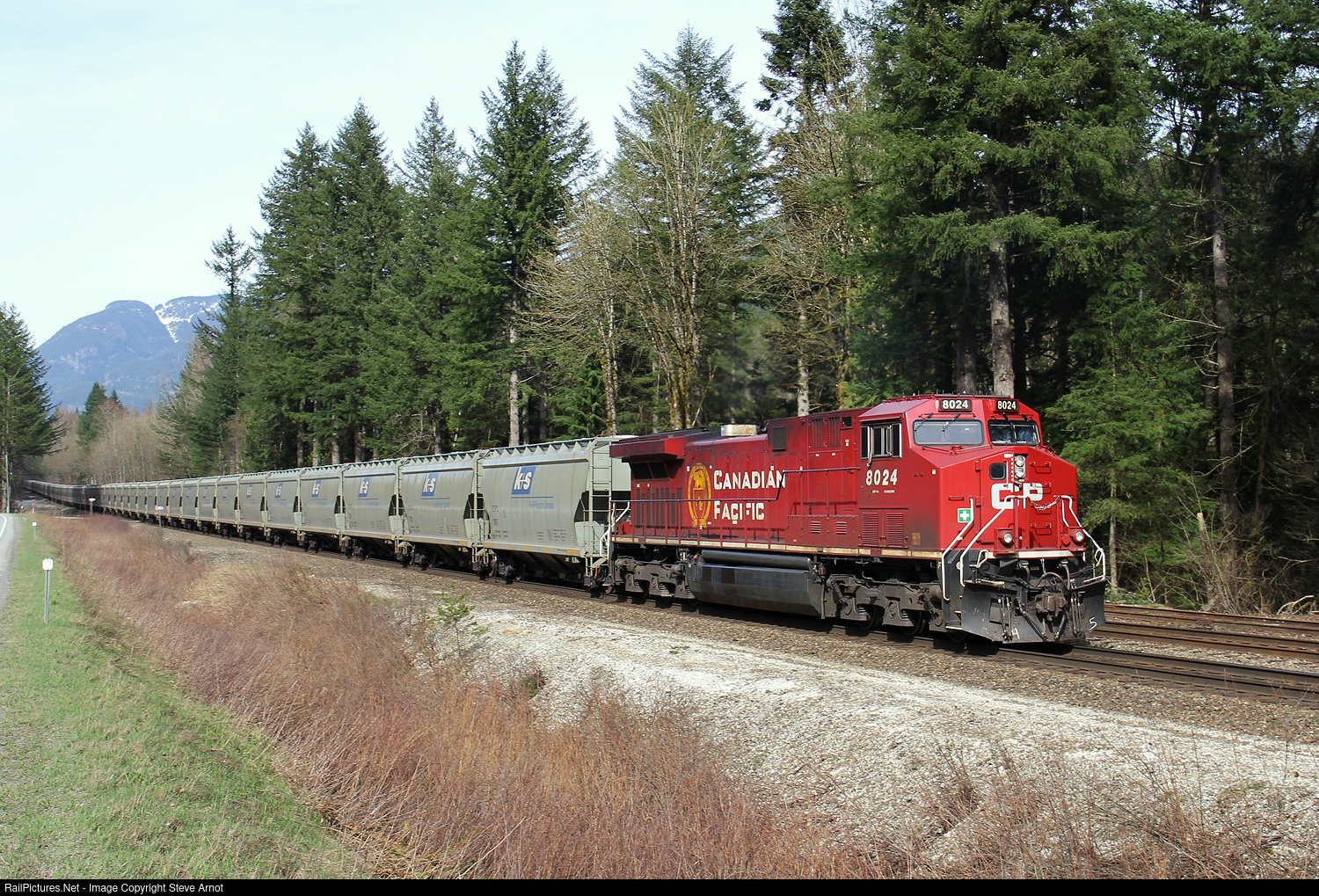 | CP AC4400CWM 8024 heads north, timetable east, on the Cascade Sub as the trailing DPU on an empty K+S Potash train. |