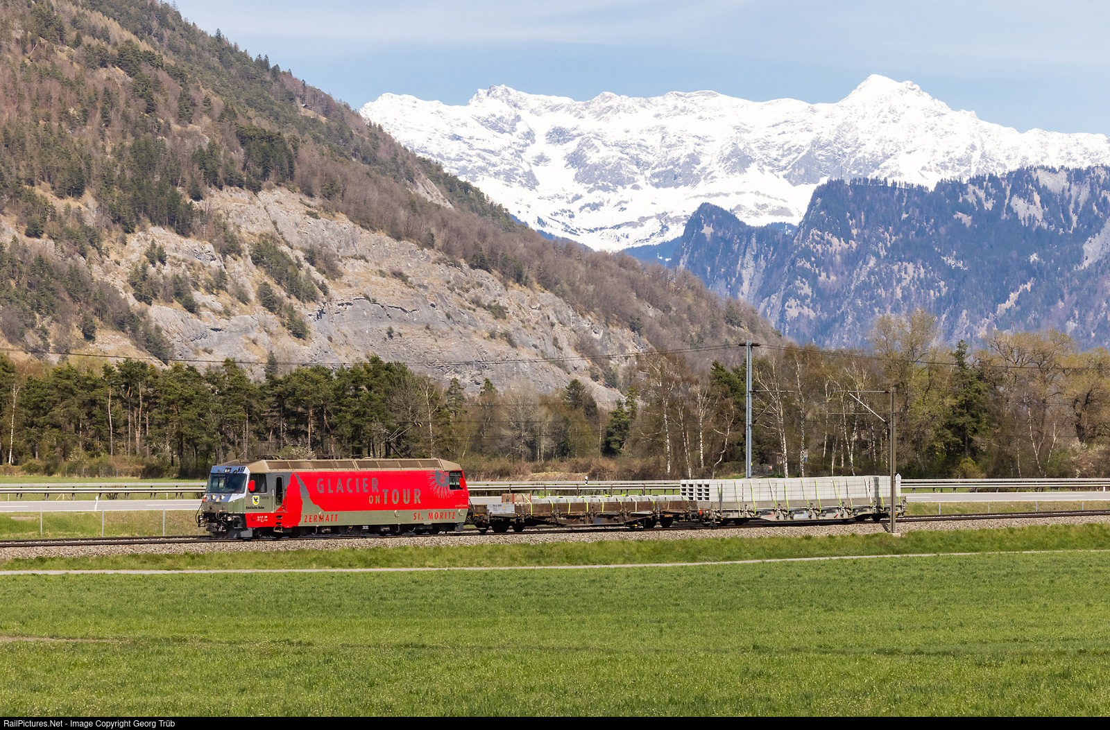 | Ge 4/4 III # 651 of the Rhaetian Railway, in the publicity paint scheme for the GLACIER EXPRESS, is pulling the short freight train 5151 from Landquart via Chur-Albula to Samedan and Pontresina, between Chur and Felsberg. |