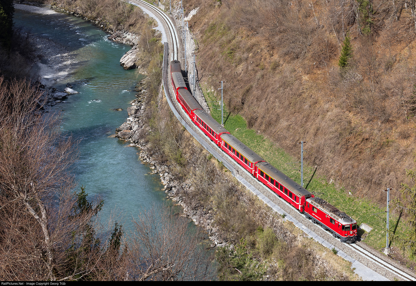 Ge 4/4 II # 614 of the Rhaetian Railway is running through the gorge of the Vorderrhein, named Ruinaulta, between Trin and Reichenau-Tamins, pulling the Regio Express 1728 from Disentis/Mustér via Ilanz-Chur to Landquart, and further as RE 1237 via Klosters to Scuol-Tarasp. The composition of the train is typical for this line, with a mixed 1st/2nd class type II car in front, followed by a first class type I car. Locomotive and car-operated trains on this line are expected to disappear this year and be replaced by Capricorn trains ABe 4/16 # 3121 to # 3166.