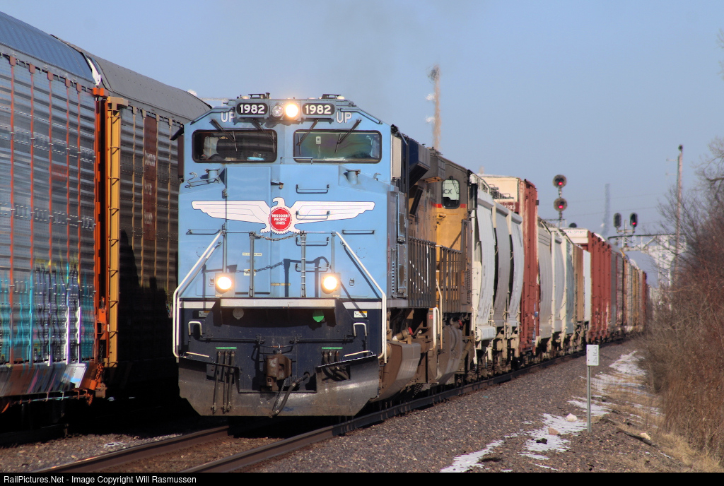 | The railfan network was working on this day in 2019 when the MoPac Heritage Unit was spotted departing the A&S Gateway Yard heading south. Thanks to come congestion around Dupo, many folks were able to get out onto the UP Chester Sub to catch it. Here's the UP 1982 South leading the MASNL under some old Missouri Pacific signals at South Dupo. |