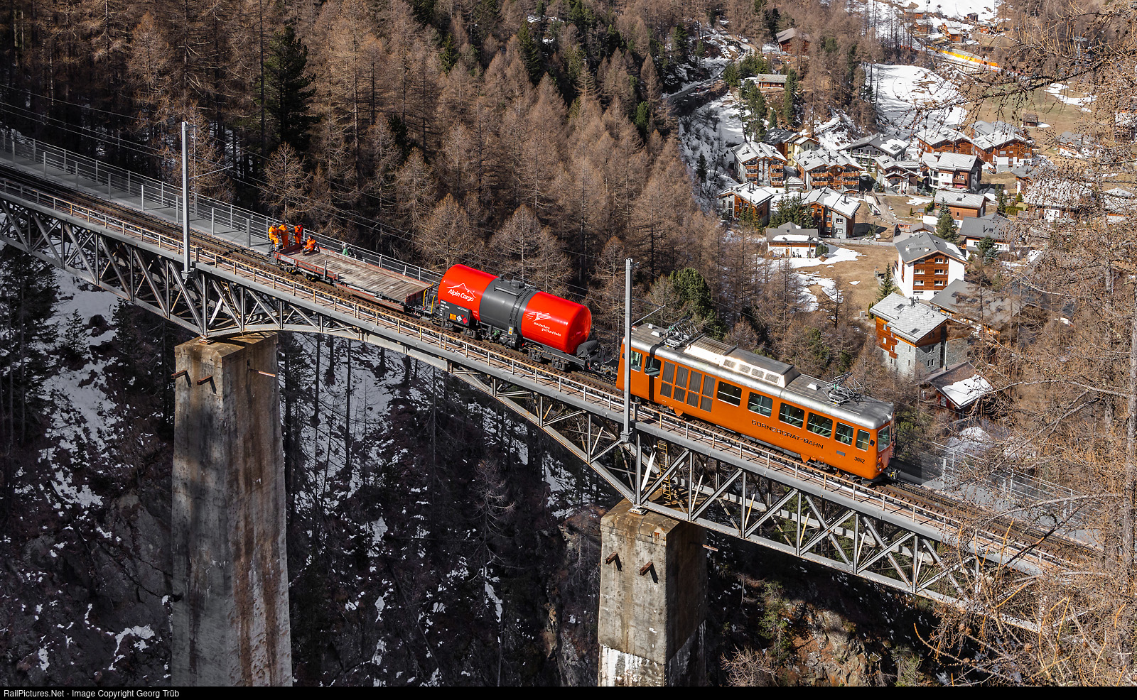 | Cogwheel railcar Bhe 4/4 # 3062 of the Gornergratbahn (GGB), built in 1981, is crossing the 93 meter long and 48 meter high Findelenbach viaduct (built 1898) above Zermatt with the freight train from Findelbach to Zermatt. The red tank car Uah # 2893 of the MGBahn brought 38000 liter of diesel fuel for the snow groomers in the Furi region. Second car is Rkm # 2657 of the MGBahn.
