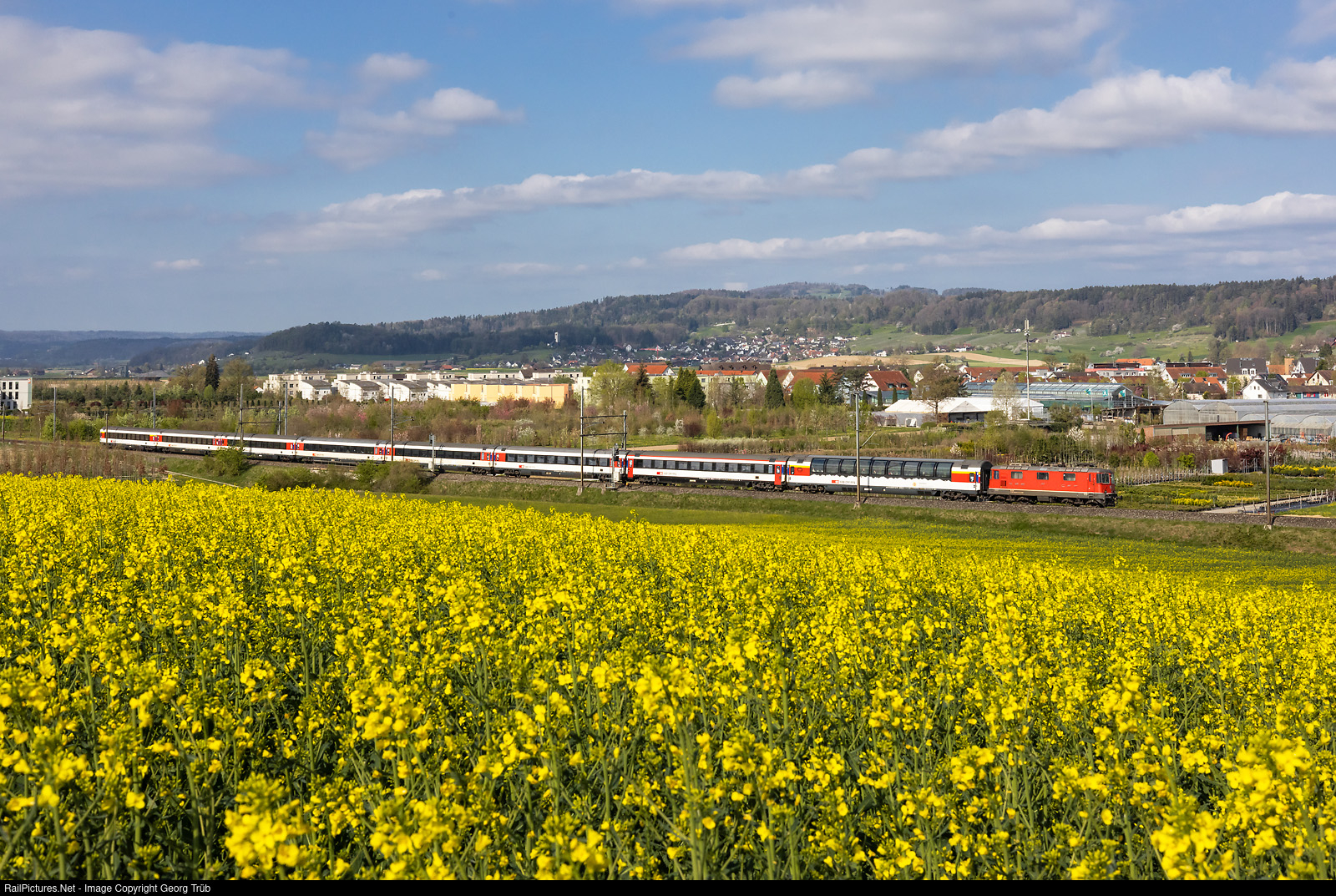| Re 420 # 121 (Re 4/4 II # 11121) of the SBB (first series) is pulling the IC 380 of the line IC 4 from Zürich via Bülach-Schaffhausen to Singen (Hohentwiel), between Rafz and Lottstetten. The train is reinforced with a Apm first class panorama car in front, and a second class Bpm, because of higher frequencies caused by the interruption of the german Rheintal line north of Basel (planned works). |