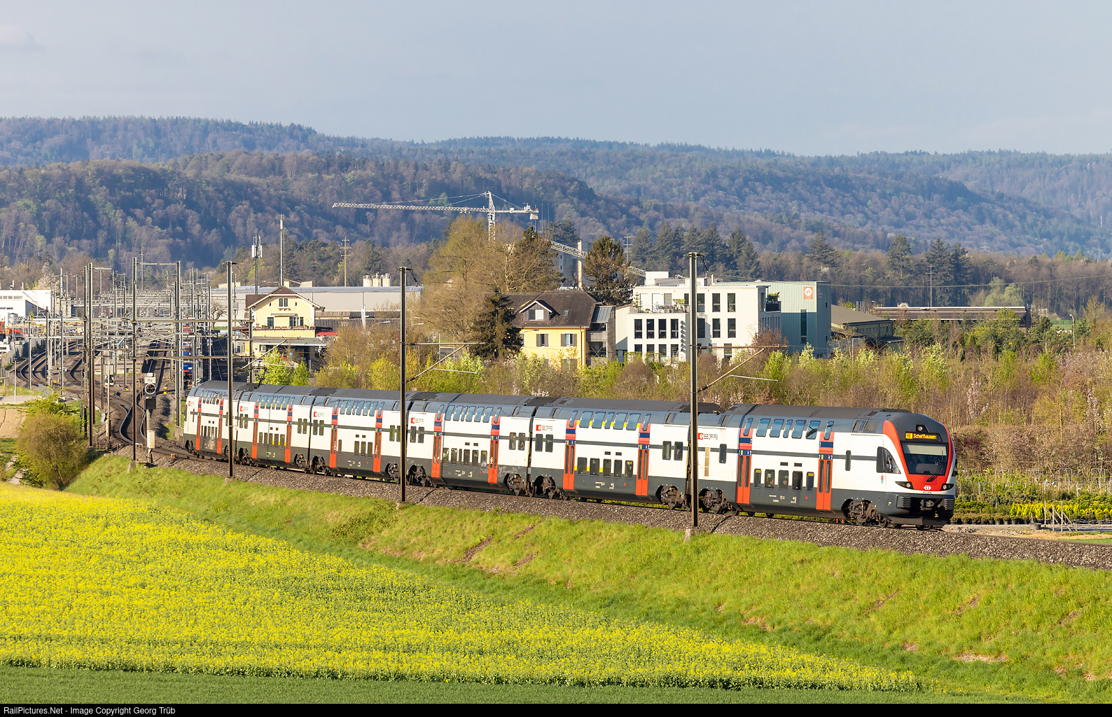 | StadlerRail doubledeck train "RVD" RABe 511 # 014 of the SBB is running the Regio Express 4912 from Zürich via Zürich Oerlikon-Bülach to Schaffhausen, between Rafz and Lottstetten. |