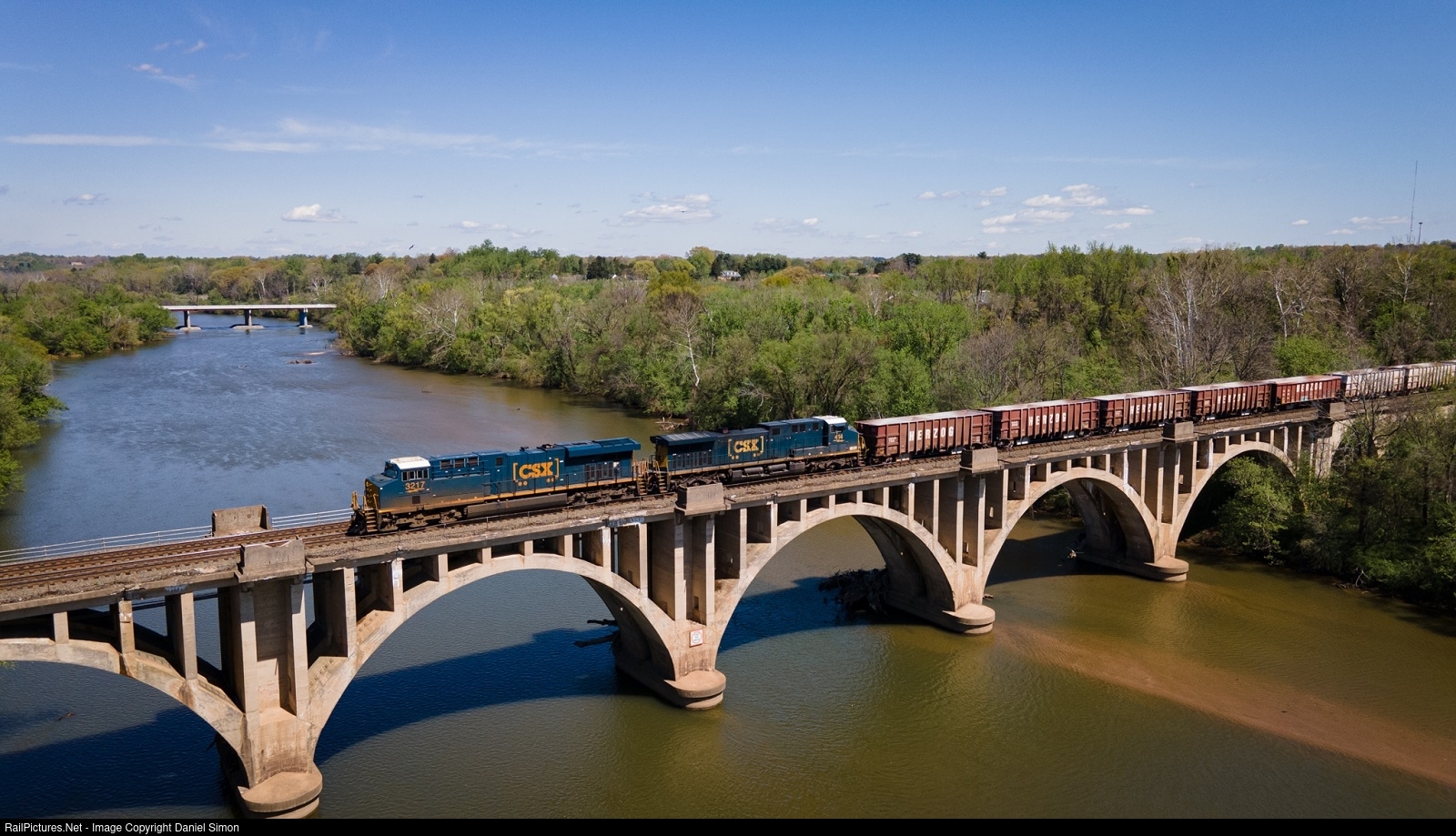 An empty CSX ballast train crosses the Rappahannock River southbound on the CSX RF&P subdivision on a beautiful Easter afternoon.