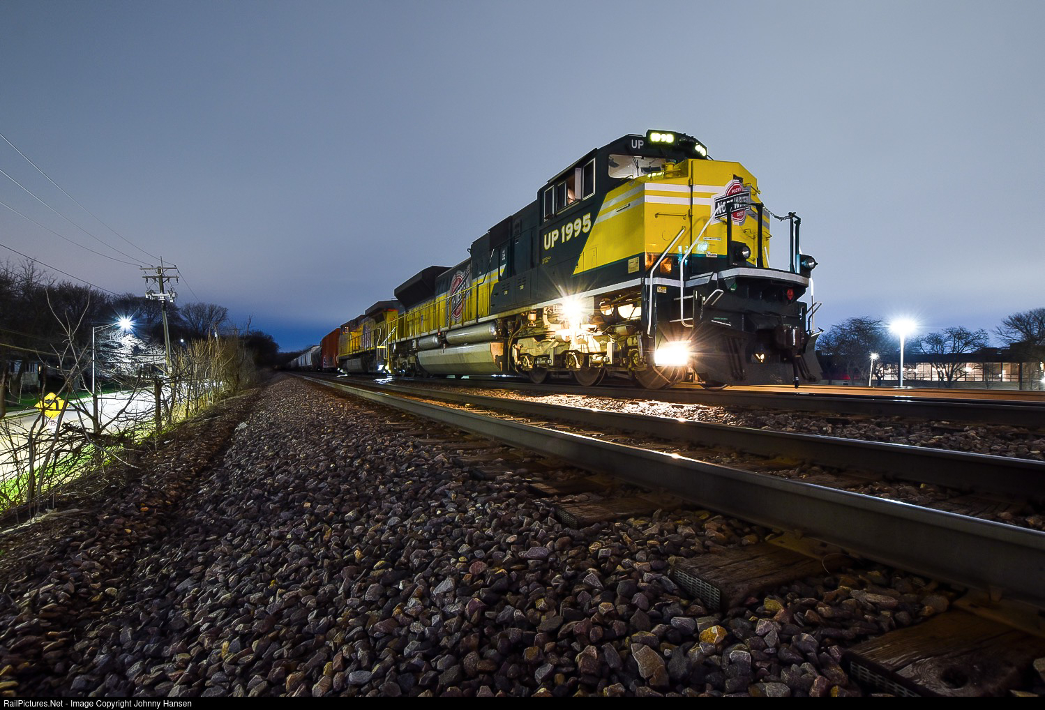 | On the evening of Easter ‘22, UP MCHCB hangs tight on the 24+ hour mark of being tied up at the holding point just west of CP University. UP 1995, the CNW heritage SD70ACe takes the point in front of another GE. |