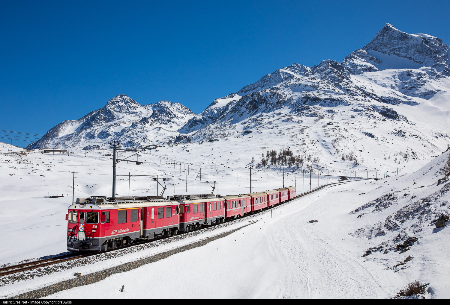 | Regio 4656 from Tirano to St. Moritz with the railcars ABe 4/4 III # 56 (Corviglia) and # 54 (Hakone) is passing the Alp Bondo. |