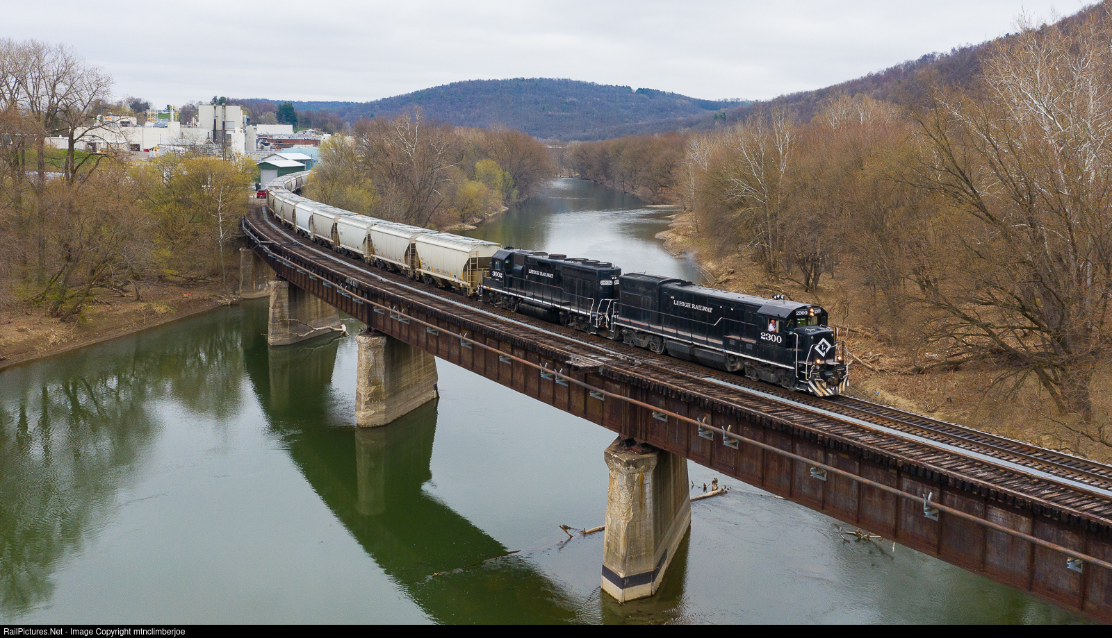 | After coming on duty and putting their train together in the yard at Towanda, Pennsylvania, the Lehigh Railway Sayre Turn heads south towards Wysox with frac sand loads to spot at the transload. The train crosses the Susquehanna River on an 1800 foot long deck plate girder bridge built in a sweeping s-curve across the river. |