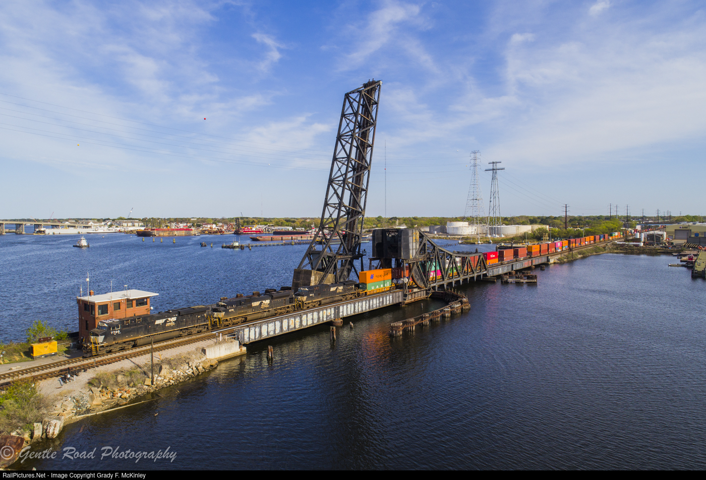 Due in large part to PSR, super long stack trains now have to pull all the way out onto Bridge 5 to make their set-offs at Portlock. This was the case on a beautiful afternoon in downtown Norfolk along the Elizabeth River as 234 pulls across Bridge 5, with out of service Bridge 5A in the background.