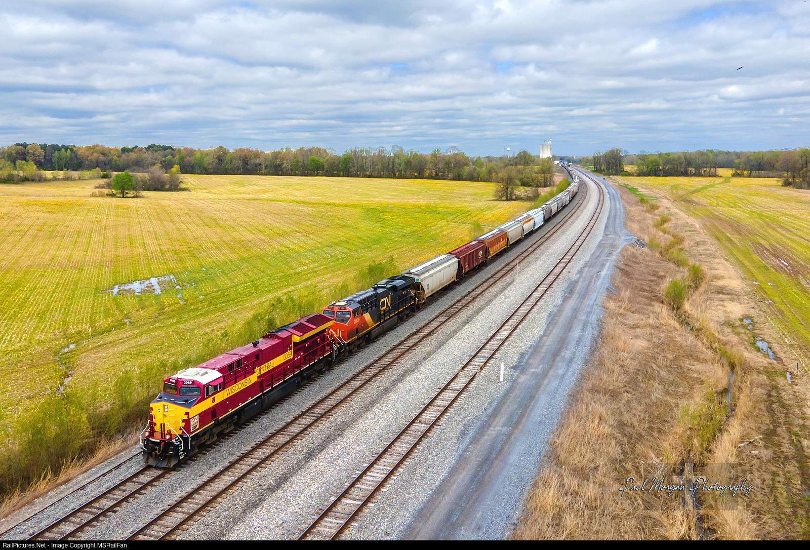 | Once it was confirmed that CN 3069 was leading the G884 SB grain, I took off to go catch it. I managed to make it to Fulton right after it made it and followed it all the way back to Memphis. Here's a shot of it leaving Fulton after it fueled. |