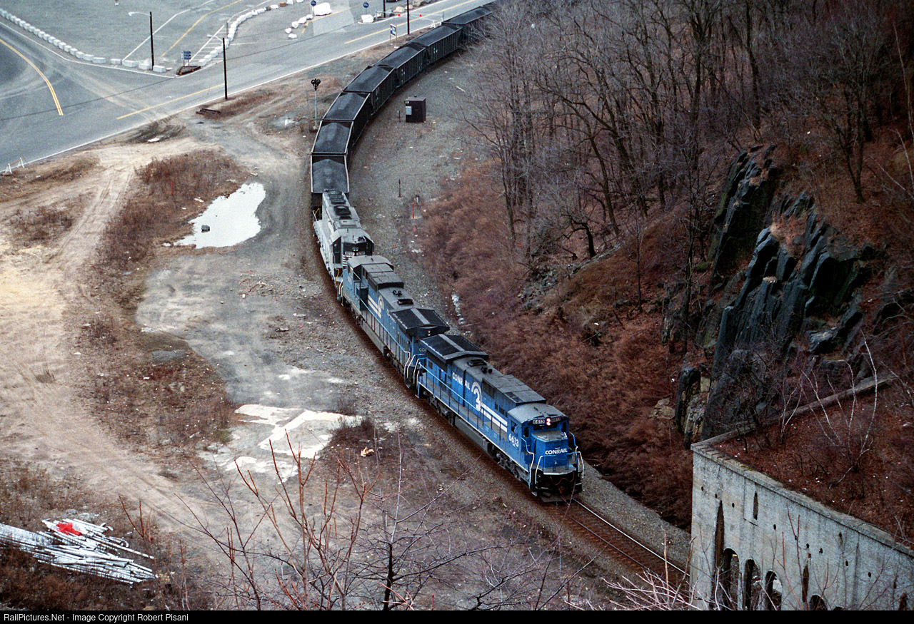 | Conrail 6613 leads 105-car loaded coal train UCR-80 into the tunnel at Weehawken, NJ. The head end has just passed the signal at CP 02 on trackage that was an extension of the River Line also known as "River Line South". The surrounding area here once contained New York Central's sprawling yard and passenger terminal complex. This trackage is now used by Hudson Bergen Light Rail trains, and of course the surrounding area is now prime real estate.
