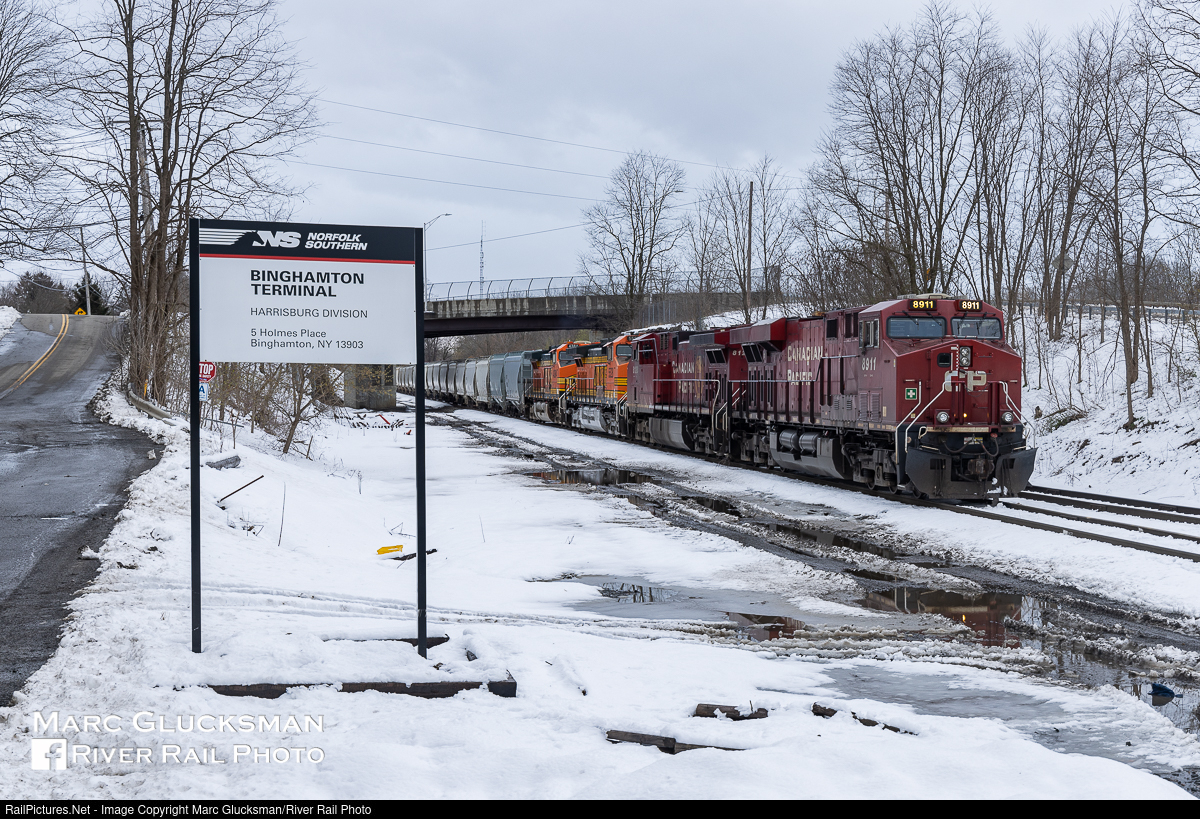 What Month Is This? What Year? A 2 day record-breaking atypical winter-like Nor’easter storm had left 14.2 inches of snow on the ground in Binghamton, New York by the morning of Tuesday, April 19, 2022, the previous record for April snowfall having been set in 2007. Notably, that was before September 19, 2015 when Norfolk Southern (NS) assumed ownership of the former Delaware & Hudson Railway (D&H) from Sunbury, PA, to Schenectady, NY from Canadian Pacific (CP). The purchase including the East Binghamton Yard, where on April 19, 2022, Train 68N (originating in Chicago, IL [CN], Frac sand loads) was awaiting departure with a robust power set of CP 8911(ES44AC), CP 8120 (AC4400CWM), BNSF 5528 (C44-9W), and BNSF 4384 (C44-9W). If not for the sign clearly denoting the modern era of ownership, one could almost imagine the throwback to some winter month during the period of Canadian Pacific control of the D&H from 1991-2015 in between that of the New York, Susquehanna and Western Railway and Norfolk Southern.