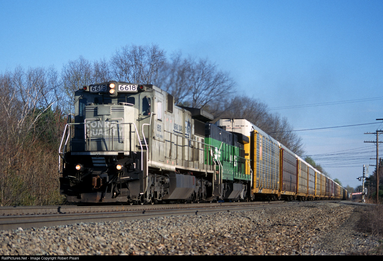 Conrail ML-433 heads west out of Selkirk Yard, crossing Game Farm Road in New Scotland, NY. Powering the train is an unusual pairing of a Conrail Ballast Express C32-8 and a Burlington Northern cabless B30-7A. ML-433 was a daily multi-level train from Framingham, MA to Sterling, MI. I recall rarely ever seeing Ballast Express units on actual ballast trains. They seemed to be assigned as needed.