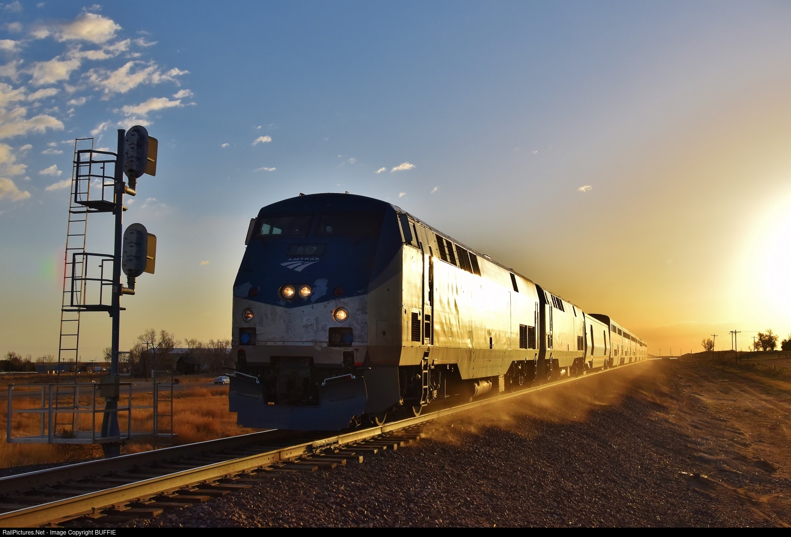 | The California Zephyr kicks up the dust at it runs track speed through the east side of Brush, Colorado at sunrise.