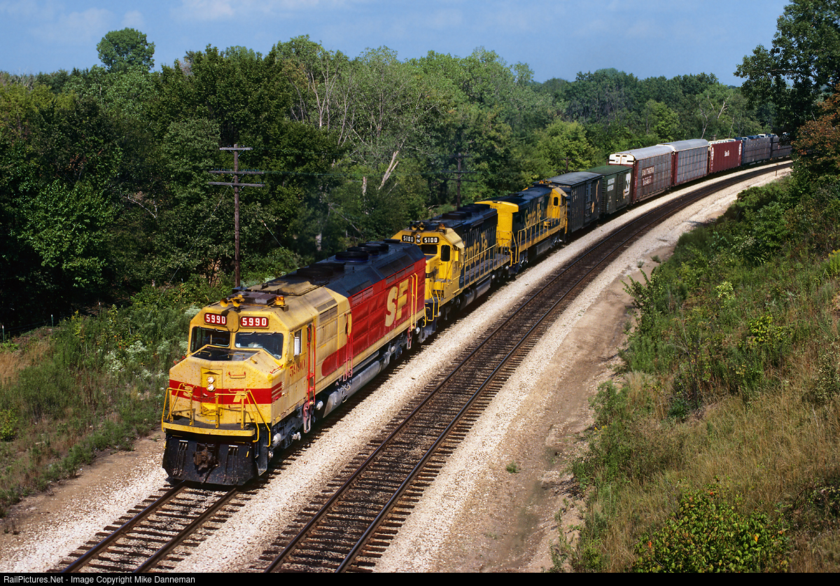 At 3:40 p.m. on August 20, 1988, A westbound Santa Fe freight climbs Edelstein Hill east of Edelstein, Illinois. The train is led by AT&SF EMD FP45 No. 5990, painted in the doomed red and yellow SPSF merger scheme. Built as No. 100 and equipped with a steam generator, the cowl locomotive pulled the railroad’s crack passenger trains to the end of Santa Fe passenger service. The future will see the locomotive once again carry the number 100 in red and silver warbonnet colors as part of Santa Fe’s Super Fleet.