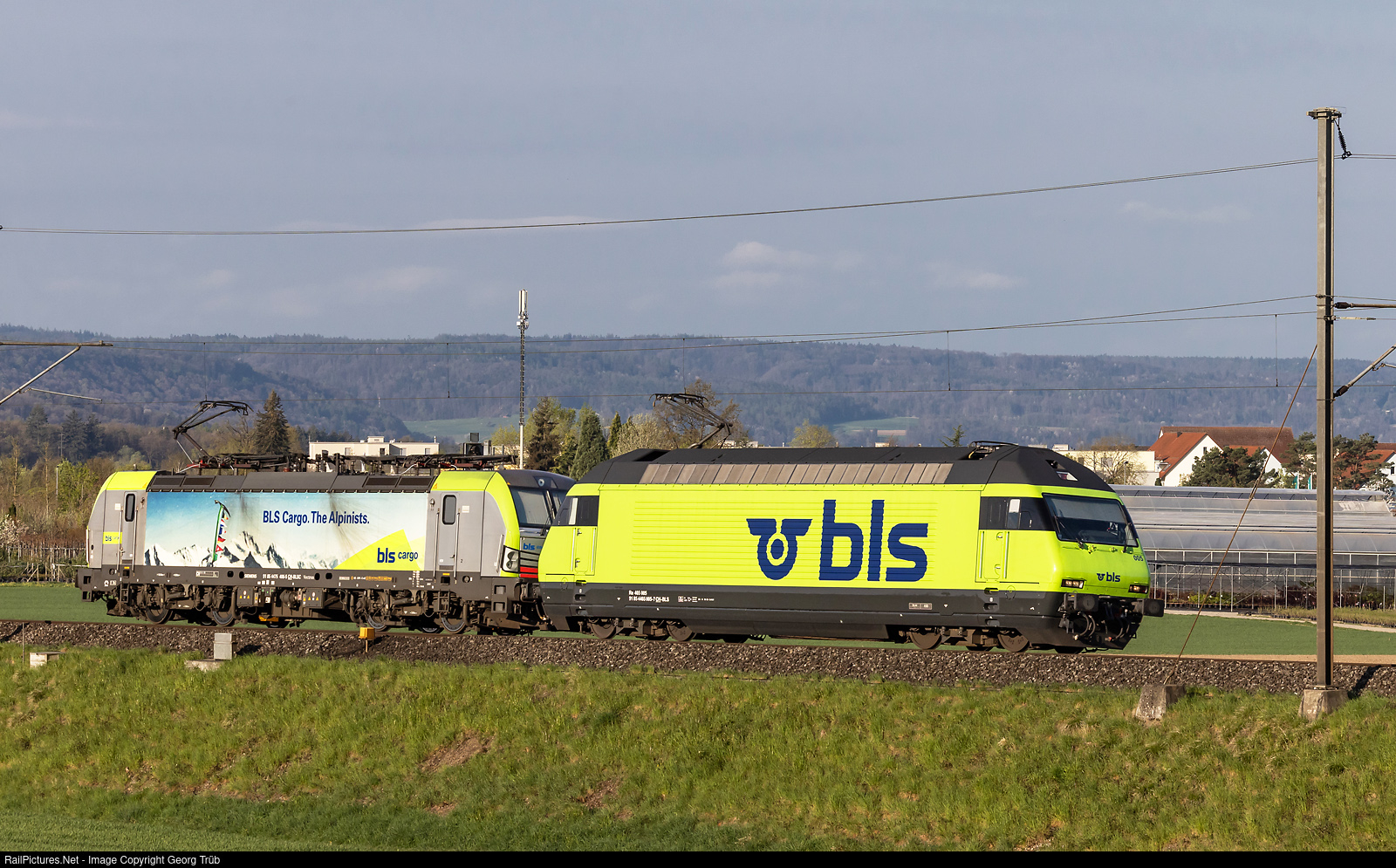 Re 465 # 005 and Siemens "Vectron" Re 475 # 406 of the BLS Cargo in multiple control are running light from Pratteln via Koblenz-Eglisau to Schaffhausen freight yard, between Rafz and Lottstetten. Since the refit of the Re 465 locomotives, there is a multiple control possible together with all modern locomotives of Bombardier and Siemens via the UIC cable. Before, this was possible with swiss locomotives with the system IIId only, for example the brown Re 4/4 (Re 425) of the BLS.