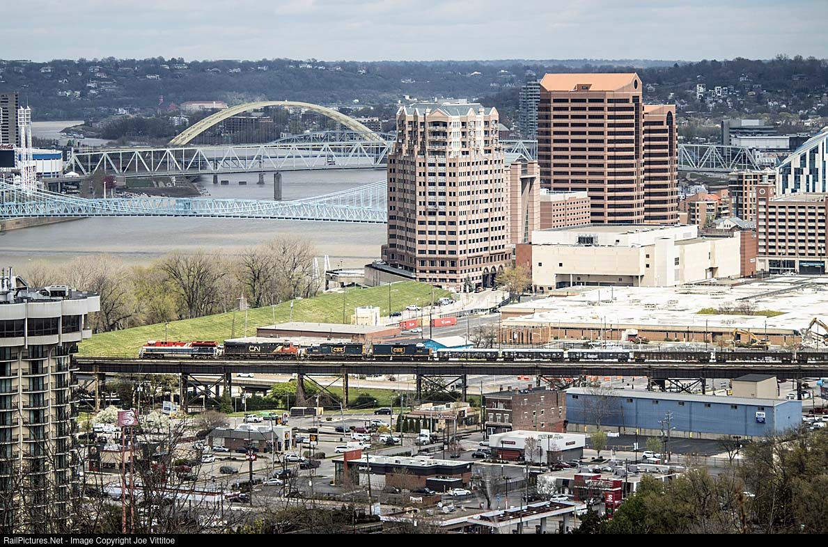 The CN BC heritage unit leads northbound CSX Q574 over Covington Ky. as its about to cross the Ohio River into Cincinnati.