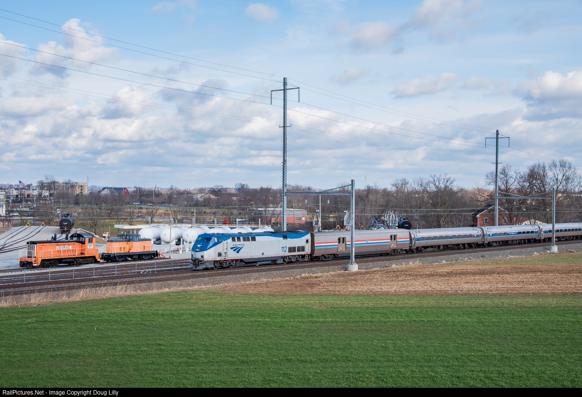 | Amtrak’s westbound Pennsylvanian rushes through Rapho, Pennsylvania. The SW1200 and GE 65-tonner on the left are used by a propane unloading facility. |