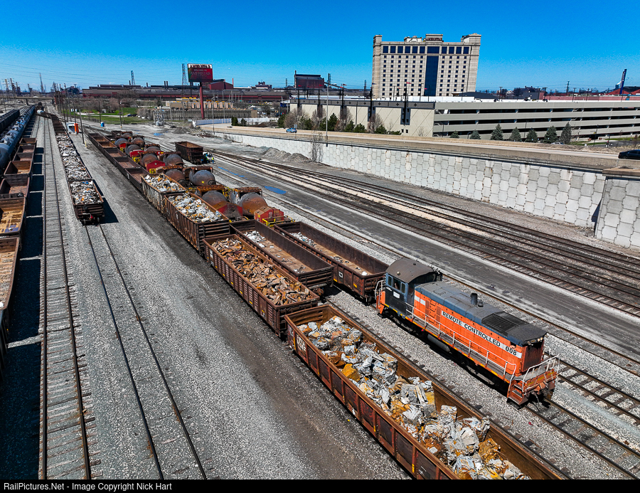 | A bottle train out of the Cleveland Cliffs' Indiana Harbor plant slows to a stop in IHB's Lakefront Yard. A former ArcelorMittal SW1001 has the honors on this sunny afternoon. Not long after this photo, the unit cut off from its train and the bottle cars would await pickup from the NS. #008 still wears Mittal paint, but has been given a Cliffs logo under the cab. |