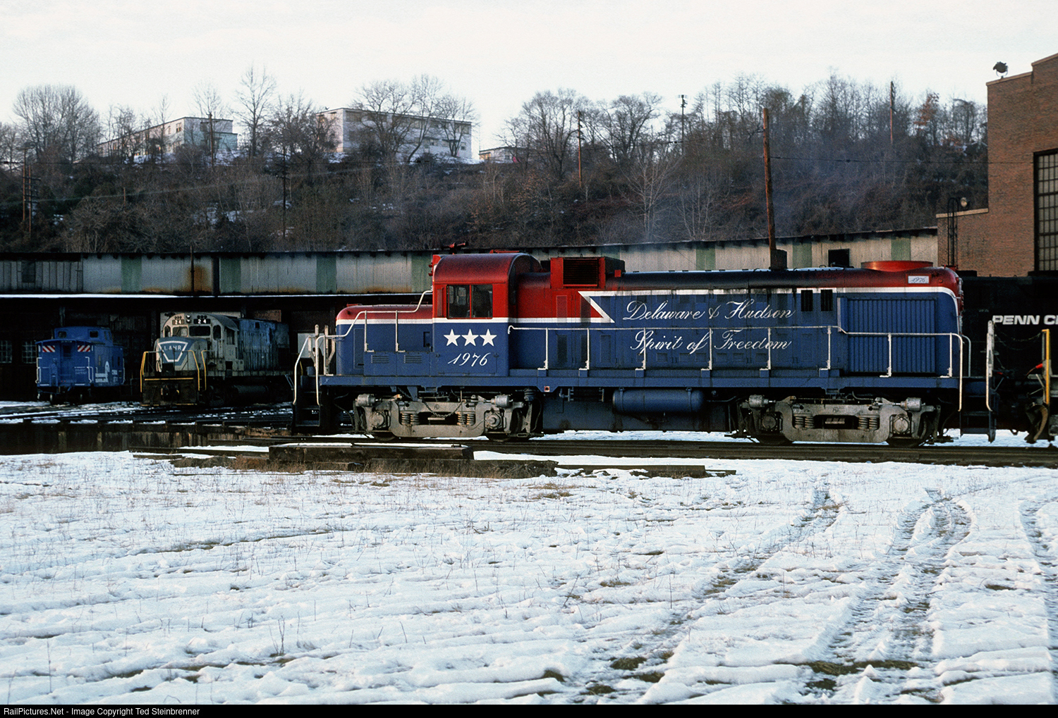 My father got this early Conrail photo in the Allentown Engine Terminal. D&H RS-3u (aka Morrison Knudsen model TE56-4A rebuild of RS-3 with a 251 engine) 1976 sits in the engine terminal with Conrail, former Lehigh and Hudson River, C420 24. I was not along for this one and was quite envious. R. T. Steinbrenner Photo.