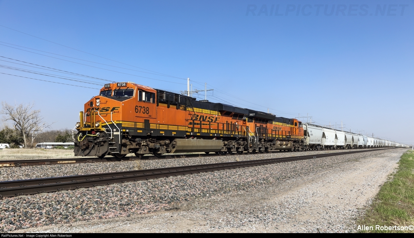 BNSF 6738 & 3827 westbound with a unit train of two bay hoppers.