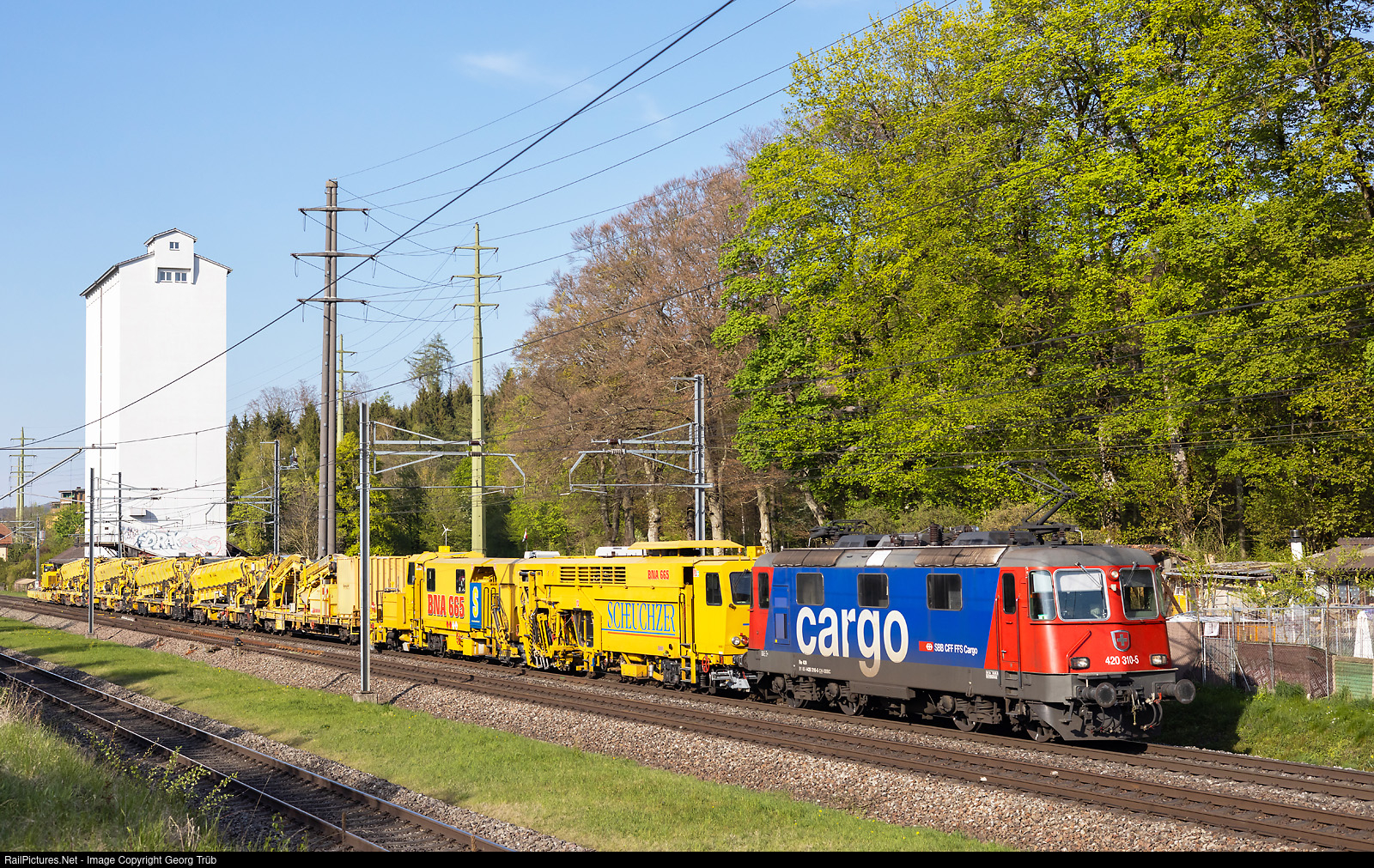 Re 420 # 310 (Re 4/4 II # 11310) of the SBB Cargo is pulling train 69268 from St.Margrethen via St.Gallen to the Limmattal shunting yard (RBL), leaving Winterthur. The train is transporting track maintenance machinery of the Scheuchzer company.
